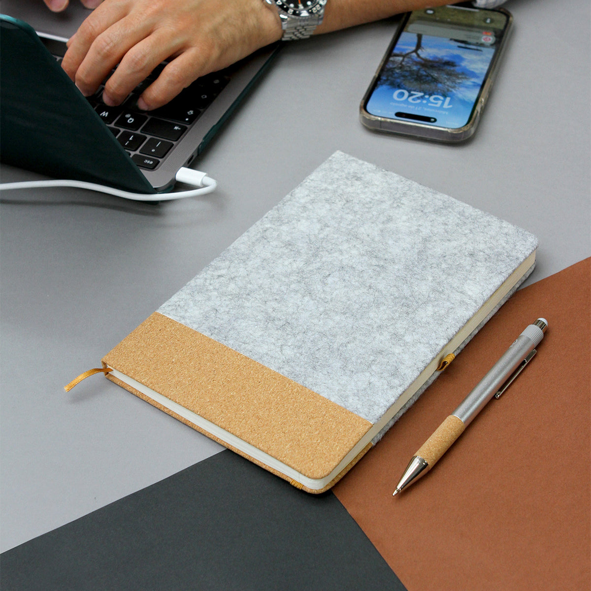 set ejecutivo fabricado en fieltro de rpet y corcho. incluye libreta, bolígrafo tinta negra y caja de regalo. 80 hojas tamaño a5 con diseño a rayas. diseño ejecutivo y ecológico.