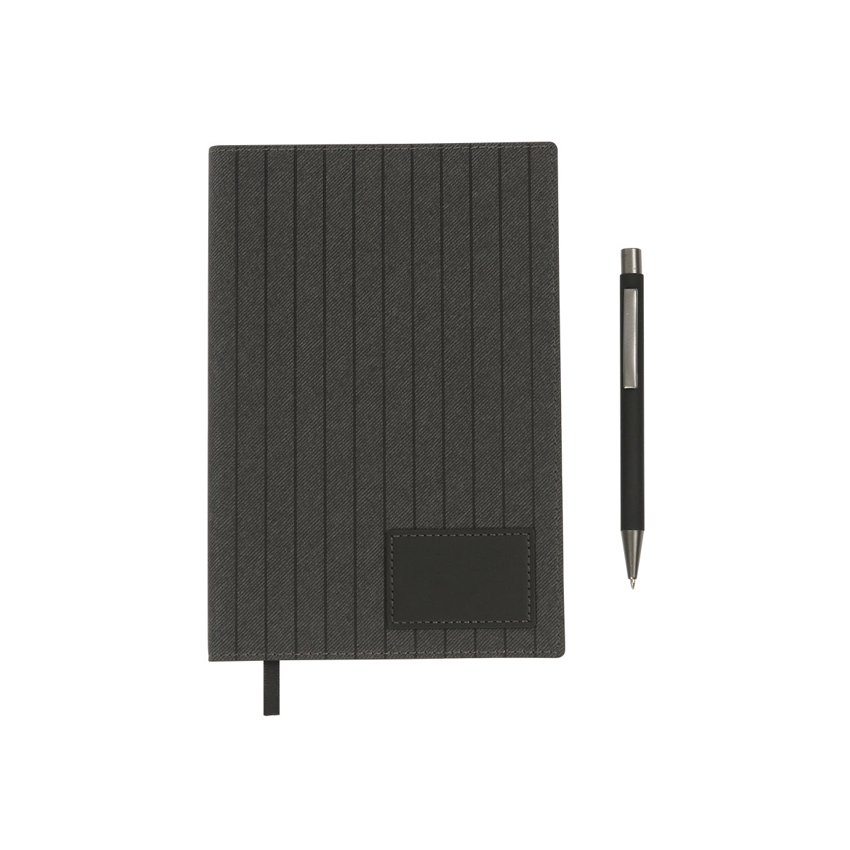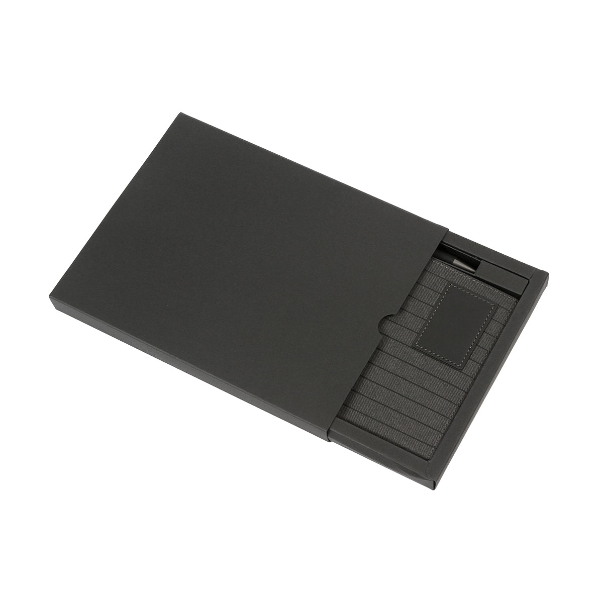 set ejecutivo, incluye bolígrafo y libreta tamaño a5 con cubierta fabricada en pu (curpiel) con una etiqueta rectangular cosida en la esquina inferior derecha. interior 135 hojas blancas de 80g. incluye caja de regalo color negro.