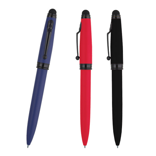 bolígrafo metálico en acabado mate, clip, goma touch screen, detalles en color negro y mecanismo retráctil.
