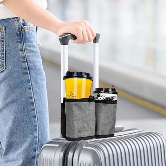 descripción del producto Práctico porta latas adaptable al sistema trolley de equipajes. Capacidad para 2 latas y/o botellas. Cierre en elástico con dona ajustable. Doble compartimento posterior para tarjetas y/o documentos