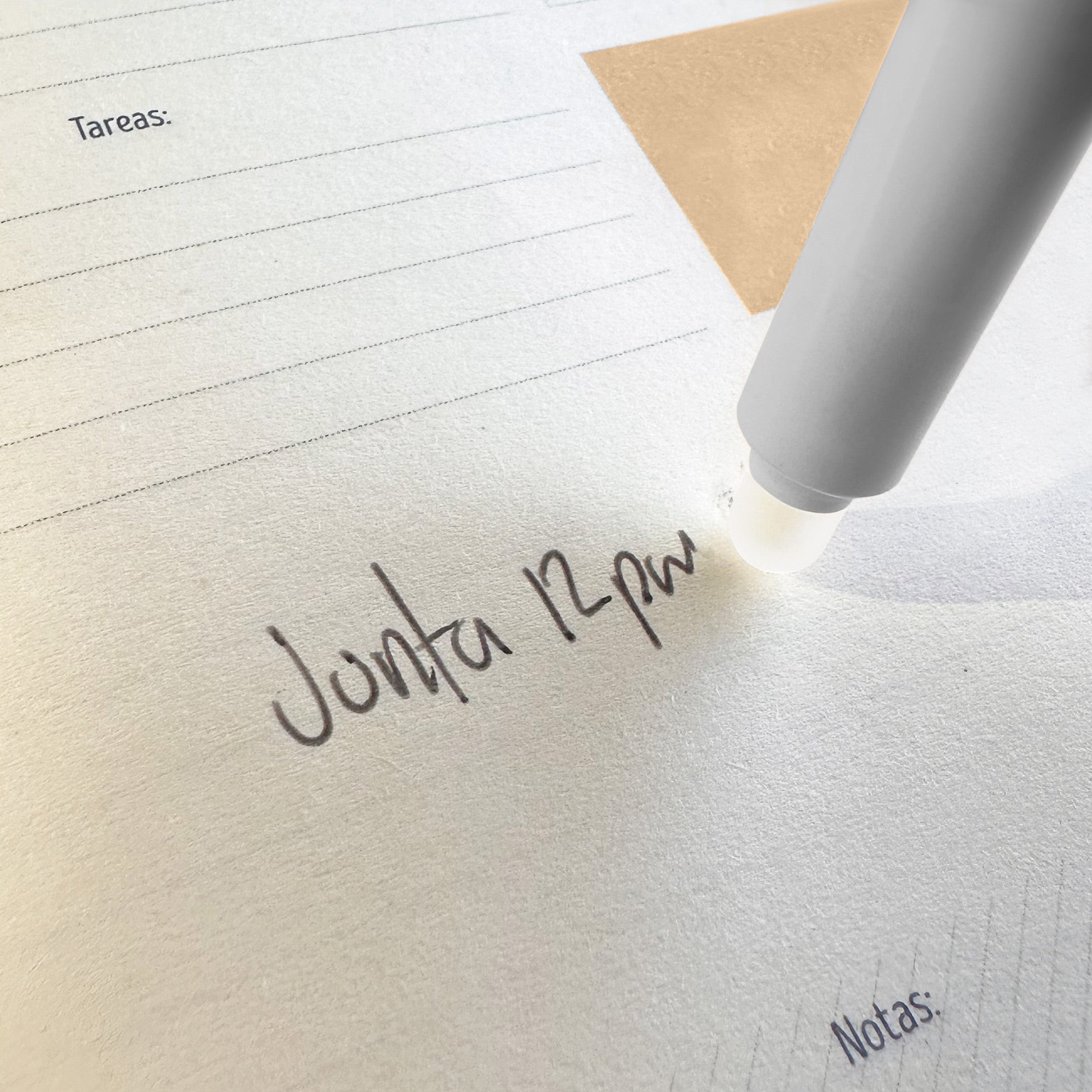 bolígrafo con tinta de gel que se borra con la fricción de la goma. mecanismo pulsador.