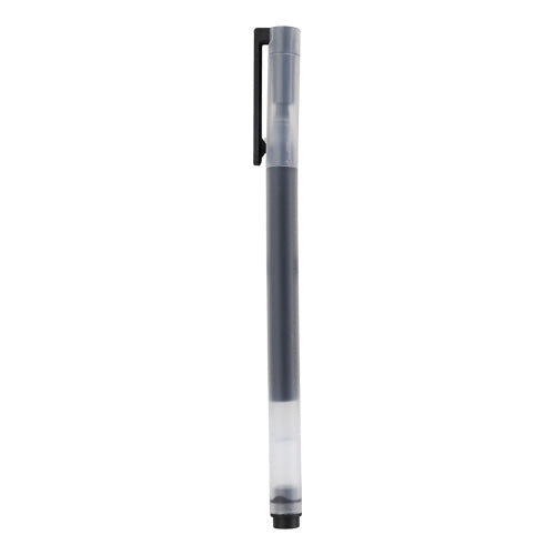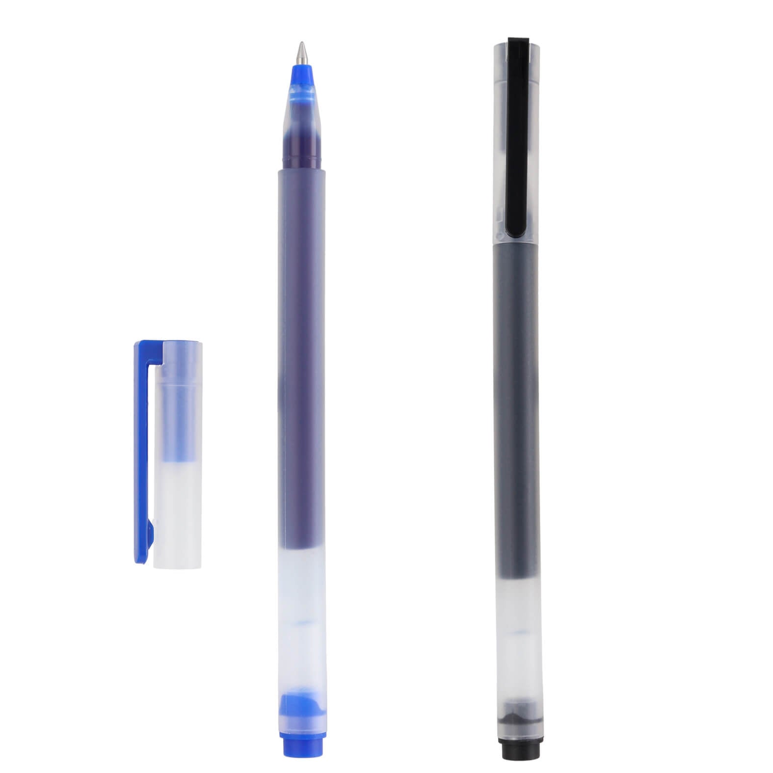 bolígrafo de plástico con tinta de gel, tapa traslúcida y clip de plástico. la tinta viene del color de la pluma. (negro y azul)