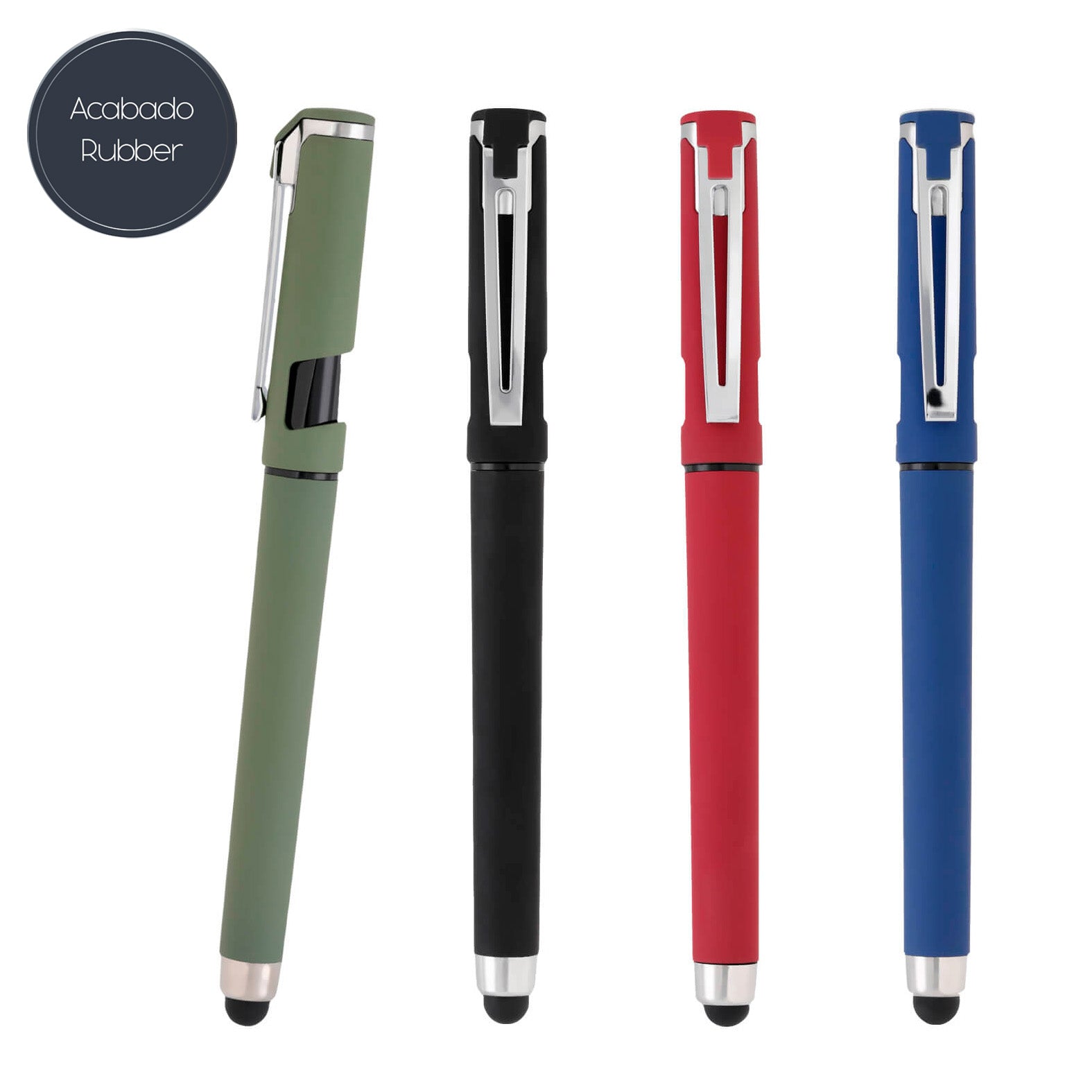 bolígrafo de plástico acabado rubber, tinta de gel y goma touchs creen. incluye tapa con clip y espacio que sirve como soporte para celular.