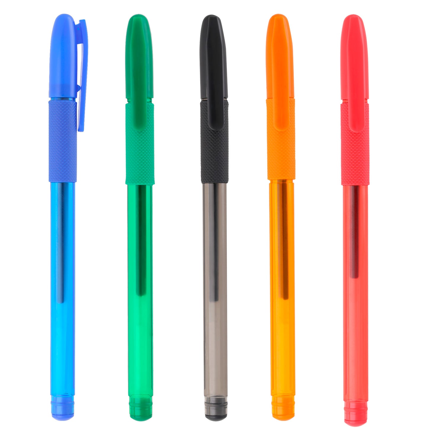 bolígrafo de plástico con tinta de gel, tapa sólida y clip de plástico.