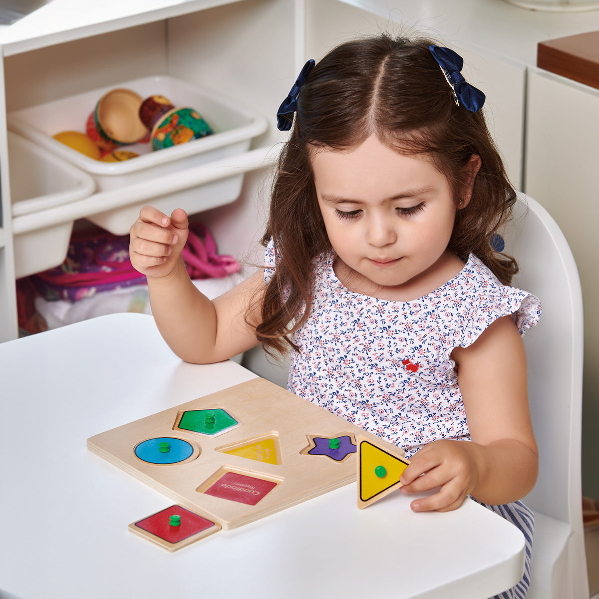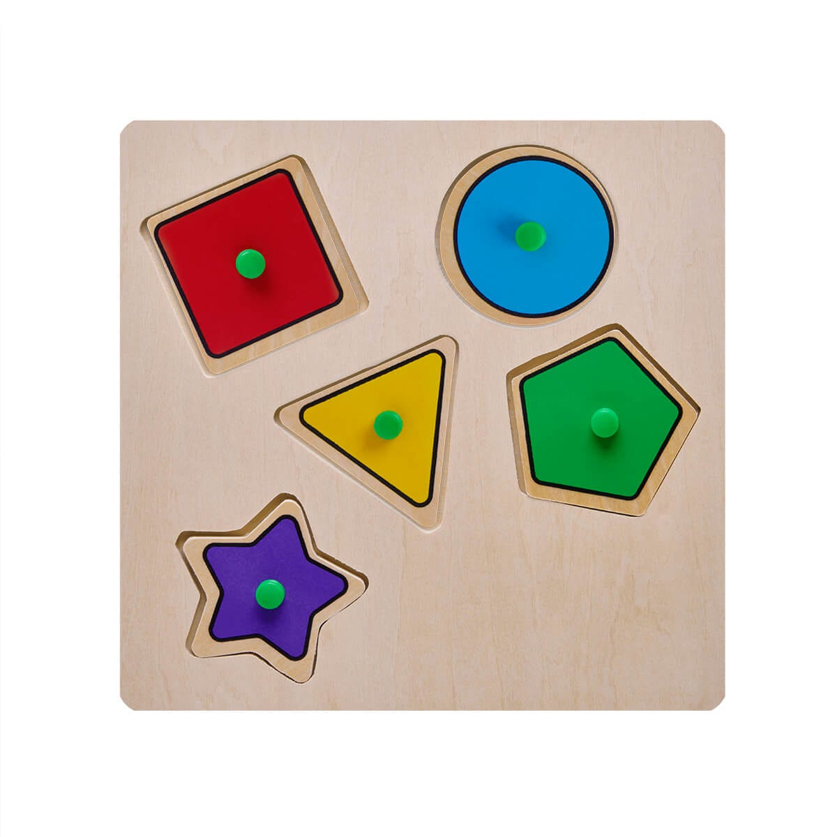 juego de madera de resaque. incluye 5 figuras geométricas con los nombres en inglés y español. cada figura es de color diferente. le permite a los pequeños aumentar el pensamiento lógico, identificar las formas y colores así como desarrollar sus sentidos y la motricidad como la coordinación mano- ojo. la madera es un producto natural el cual puede presentar variaciones en tonalidades y vetas. este producto por ser últimas piezas puede presentar alguna variación, no se aceptan devoluciones.