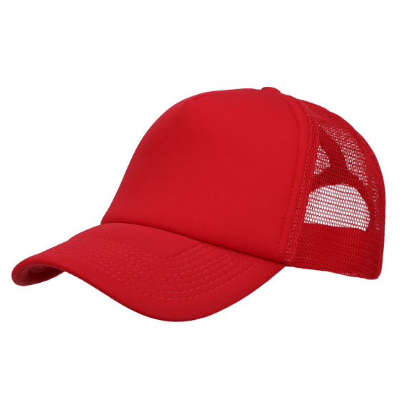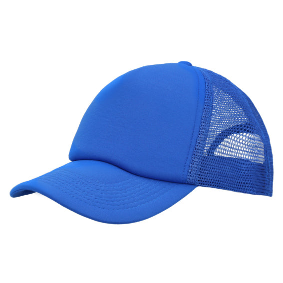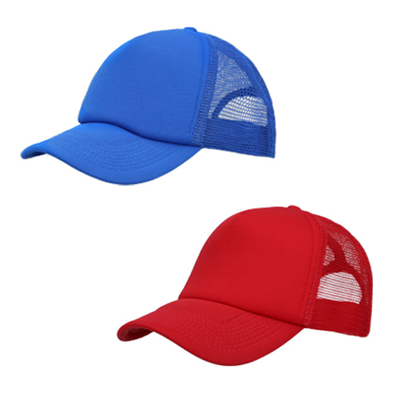 gorra 100% poliéster conbroche de plástico,visera rígida y color uniforme. cuenta con 1 gajo frontal de color solido y 4 gajos con malla en la parte posterior.