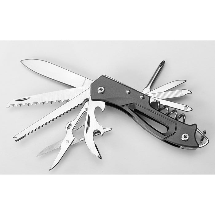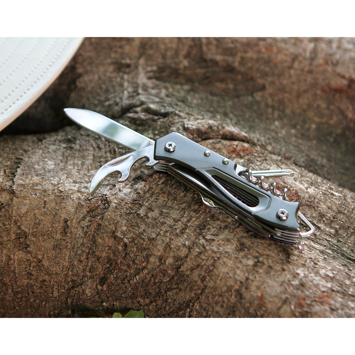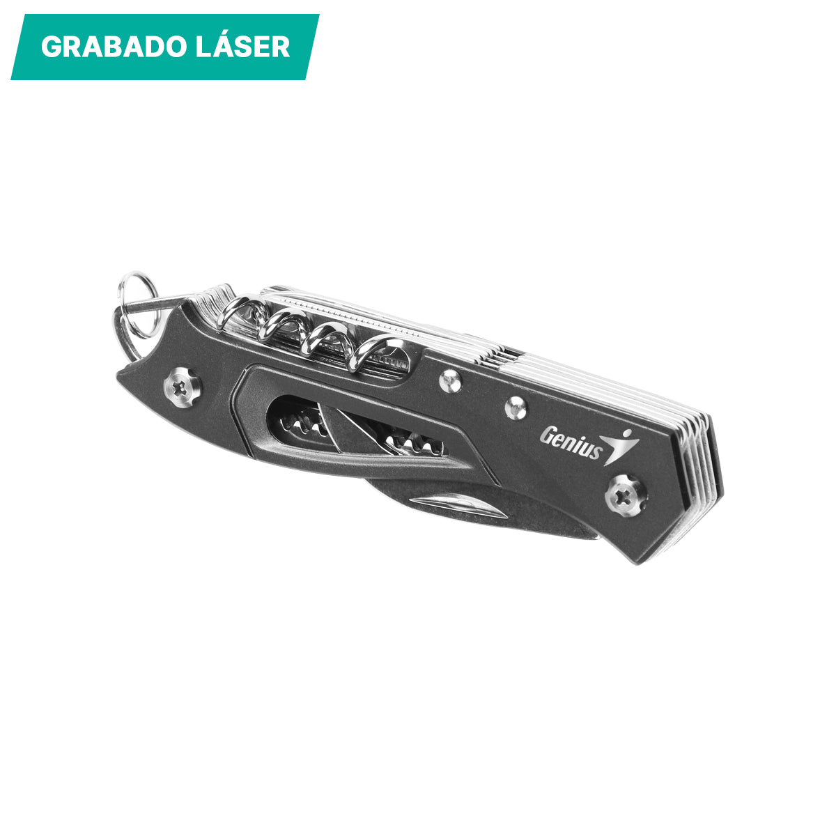 navaja de acero inoxidable y cubierta de alúmina con 10 funciones. incluye estuche.
