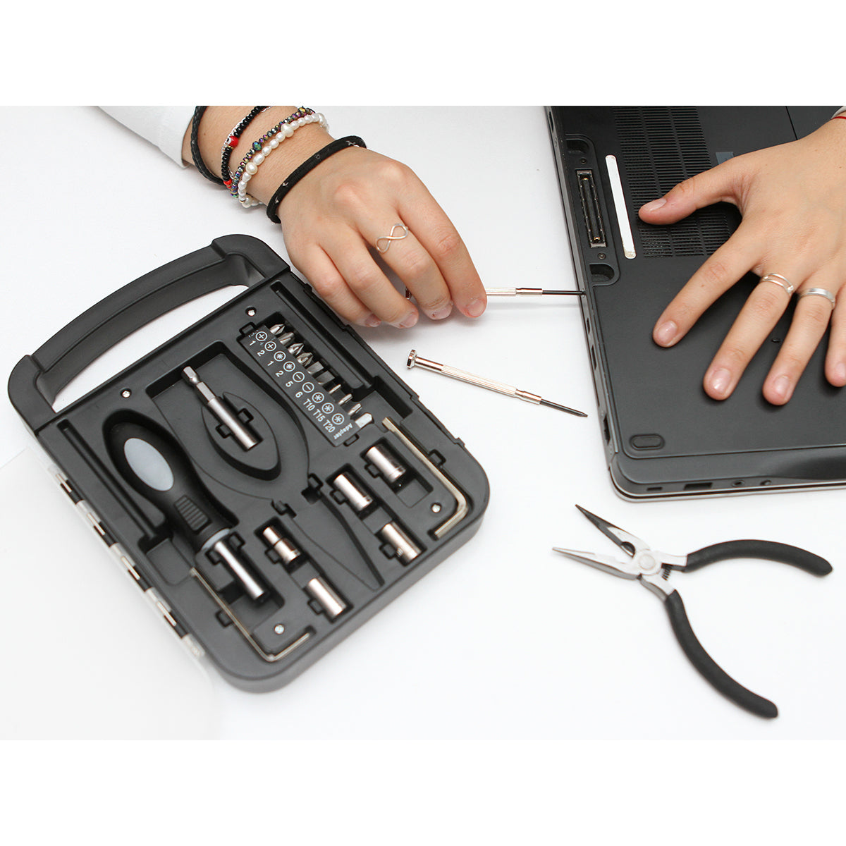 set de herramientas en estuche de plástico con asa y 22 piezas: pinzas, 2 desarmadores, 10 puntas intercambiables, adaptador para puntas, 5 dados, 2 llaves allen y mango para dados.