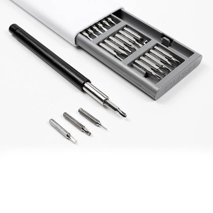set de plástico color blanco con 24 puntas de desarmador intercambiables y mango adaptador.