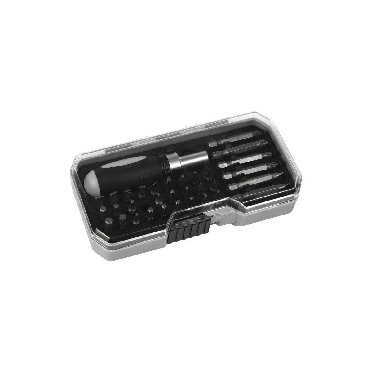 juego de desarmador con 33 puntas intercambiables fabricadas en acero carbono. incluye estuche de plástico pp + ps. es perfecto ya que cuenta con un diseño compacto para un fácil transporte.