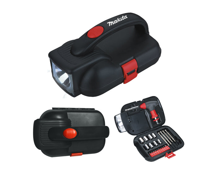 juego de herramientas con lámpara. incluye: maneral y extensión, 8 dados, 10 puntas de desarmador, 4 desarmadores de relojero. utiliza 4 baterías aa (no incluidas). presentación: caja en color negro.