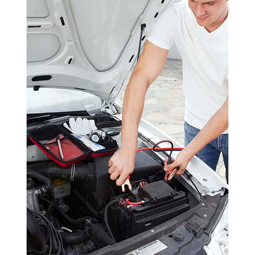 contiene cables pasa corriente (100 amp), medidor de presión de aire (50 psi), guantes, impermeable, vendas adheribles para proteger heridas, pinza, estuche y lámpara para cabeza con 7 leds, utiliza 3 baterías aaa (no incluidas).