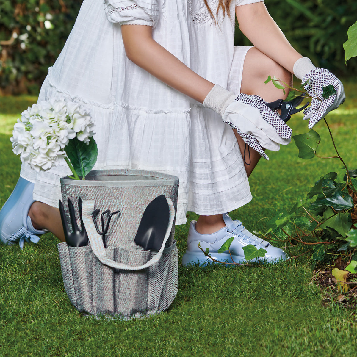 set de jardín que incluye pinzas de corte, pala ancha, horqueta, rastrillo, guantes de algodón con antiderrapante y bolsa con asa. este producto por ser últimas piezas puede presentar alguna variación, no se aceptan devoluciones.