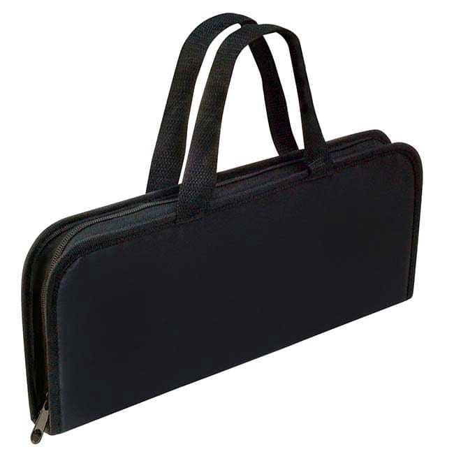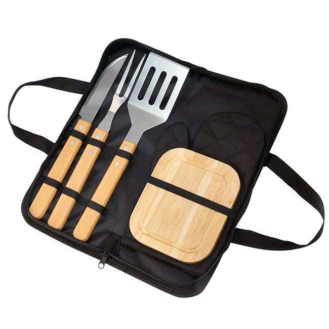 descripción del producto Estuche con ziper y asas. Incluye trinche, cuchillo, espátula, tabla pequeña para picar y guante.