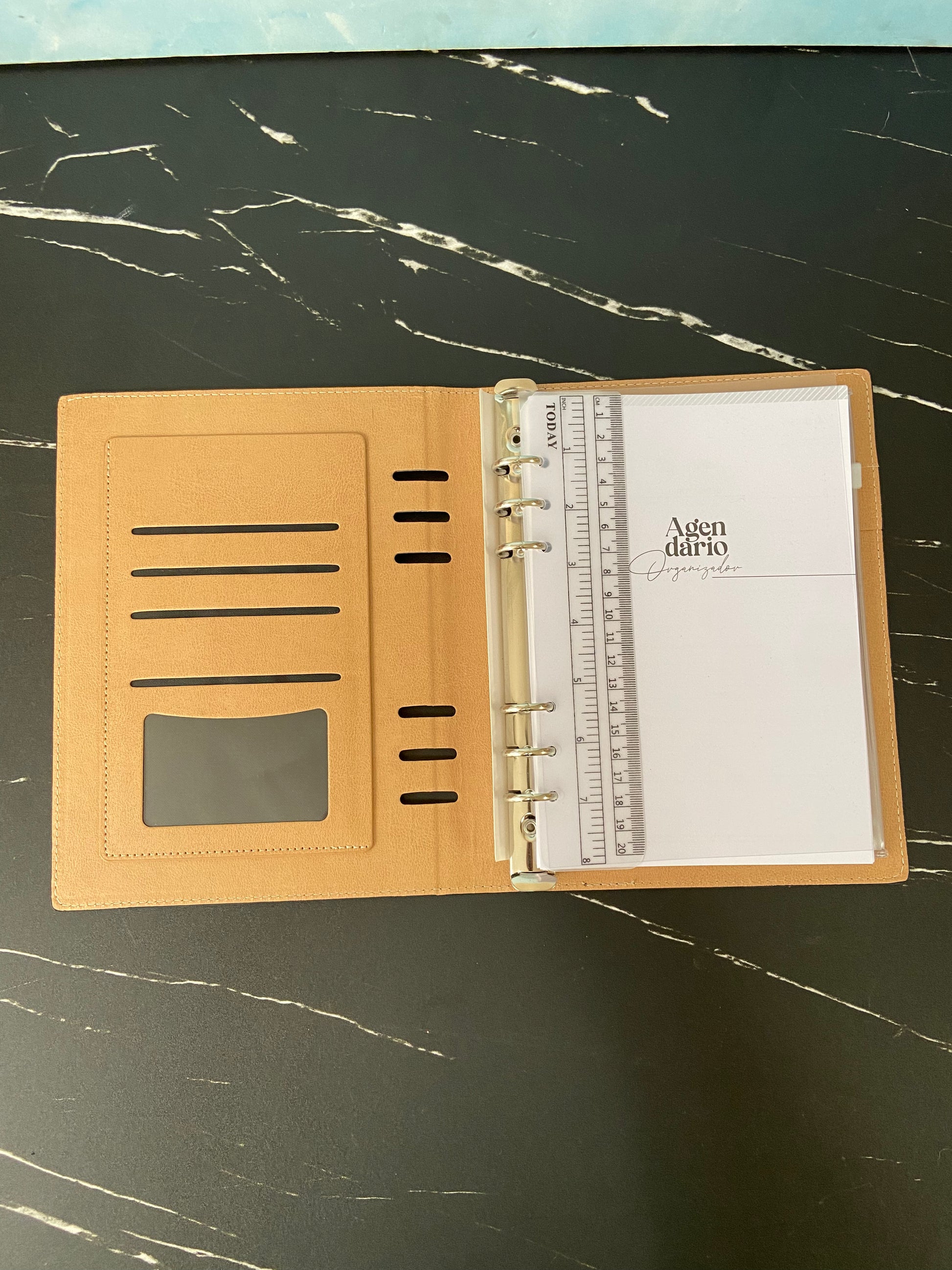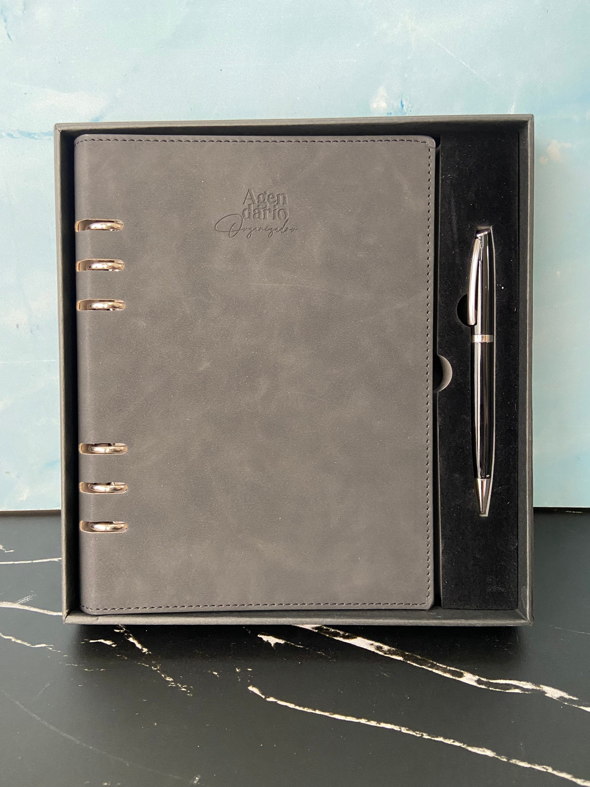 carpeta tipo agendario organizador de pasta rígida de 6 arillos de metal, su cubierta cuenta en la parte interna con 4 compartimentos para credenciales, uno con ventana plástica, sujetador para bolígrafo. contiene 96 hojas en total (192 pág.): hoja de dedicatoria, hoja de datos de contacto, calendarios del 2025 al 2028, planificadores anuales (4), planificadores de gastos (4), planificadores de proyectos (5), hojas rayadas y hojas punteadas para notas. incluye: regla de 20 cm, bolsa de pvc con cierre a presión y bolígrafo de aluminio acabado brillante con detalles en cromo. puedes adquirir el repuesto parker en tinta azul para este bolígrafo. presentación: caja en color negro.