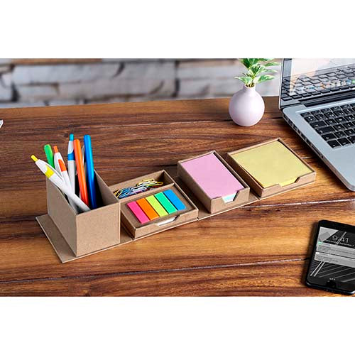 incluye porta plumas, clips, 150 notas adheribles amarillas, 50 hojas de notas blancas, 100 hojas de notas multicolor y banderas de 5 colores.