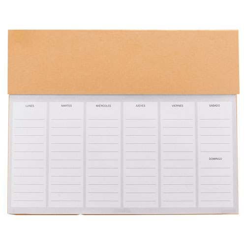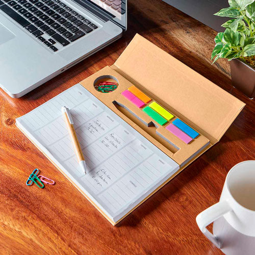 programador semanal con 100 hojas. incluye bolígrafo ecológico, clips y banderillas adheribles de 6 colores.