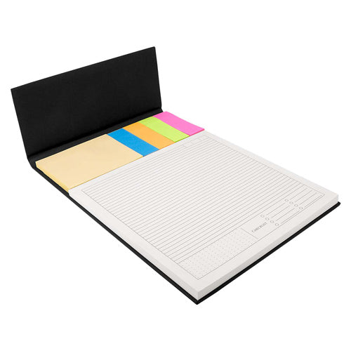 incluye block de notas con 70 hojas de raya con medida de 20.3 x 20 cm, notas adheribles y banderillas de 4 colores.