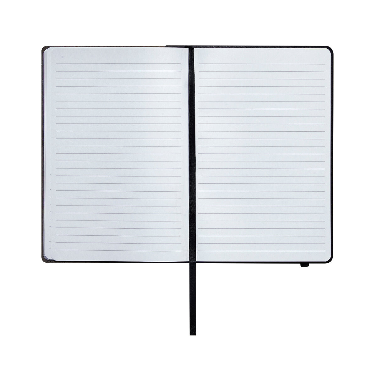 libreta con 80 hojas a rayas. pasta con laminado de encino y base color negro que se descubre al aplicar grabado láser. incluye separador de hojas y elástico para cerrar. la madera es un producto natural el cual puede presentar variaciones en tonalidades y vetas.