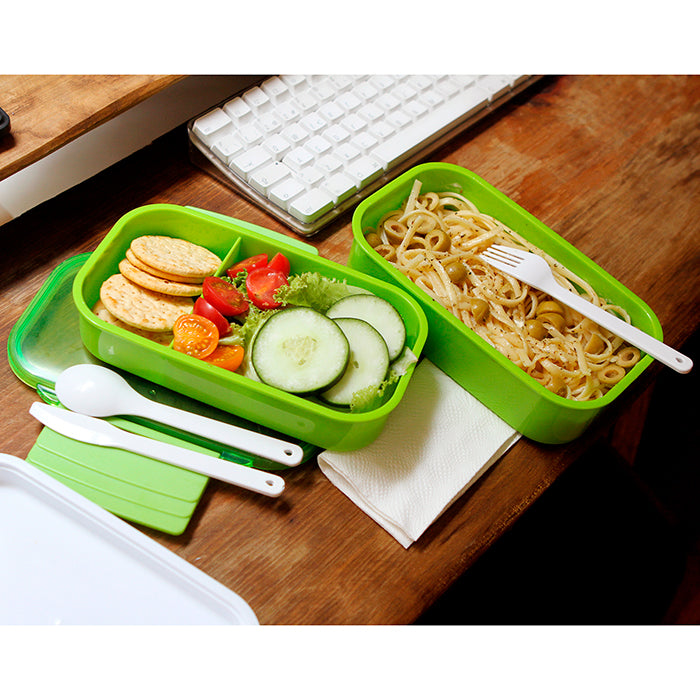 contenedor de alimentos con dos compartimentos, fabricado en polipropileno y abs. cuenta con un broche de seguridad para un cierre hermético y viene con cubiertos (cuchara, tenedor y cuchillo).