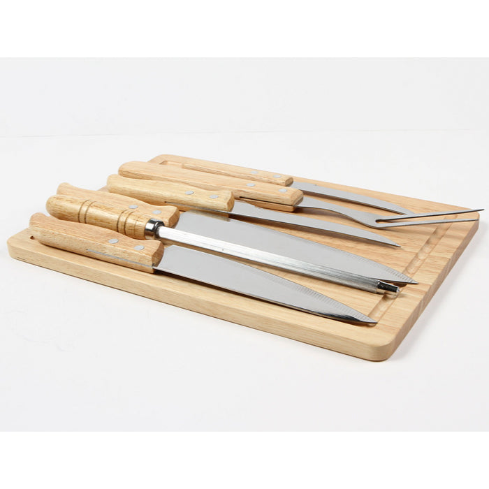 set de bbq fabricado en acero inoxidable y mangos de roble, incluye 7 piezas (cuchillo de chef, cuchillo pequeño, cuchillo deshuesador, cuchillo para carne, tenedor, afilador y tabla para cortar de madera).