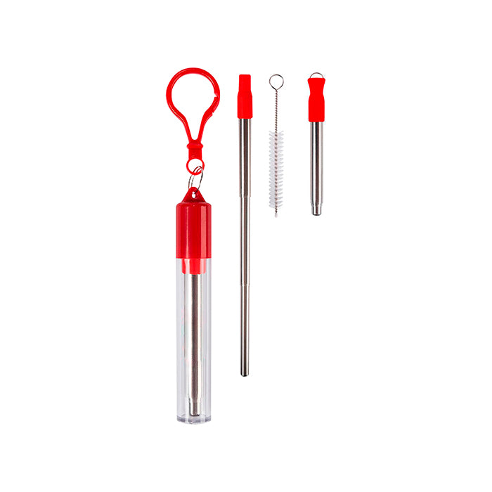 popote retráctil reutilizable de acero inoxidable, contiene cepillo para fácil limpieza y practico estuche de acrílico con arnés para llevarlo a todas partes, se puede grabar en el popote y cuenta con un área amplia para impresión en el estuche. son ideales para viajar y responsables con el medio ambiente.
