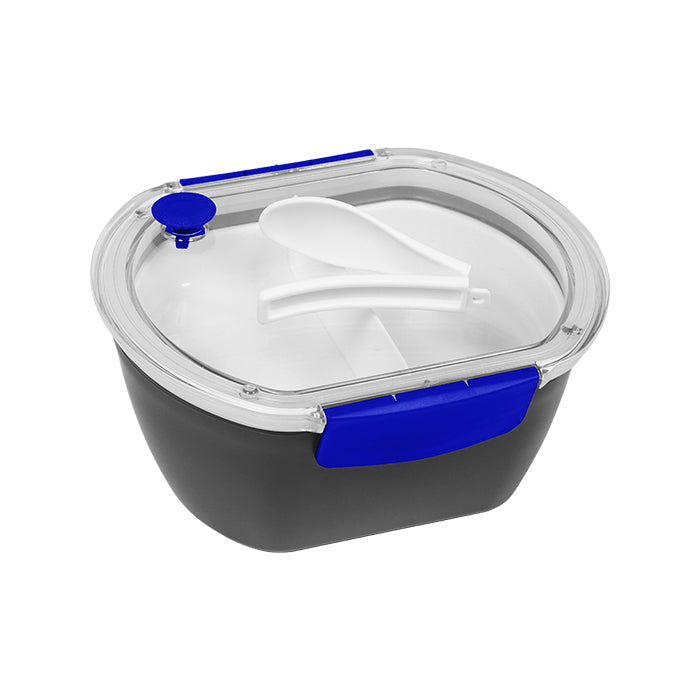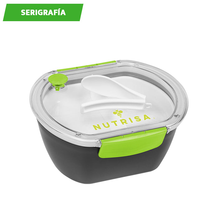 contenedor para alimentos con base en color negro fabricada en as y tapa translúcida de silicona, cuenta con accesorios de colores que le dan un aspecto atractivo y moderno. además, los compartimentos internos y la cuchara incorporada te brindan comodidad y versatilidad en el transporte y consumo de tus alimentos.