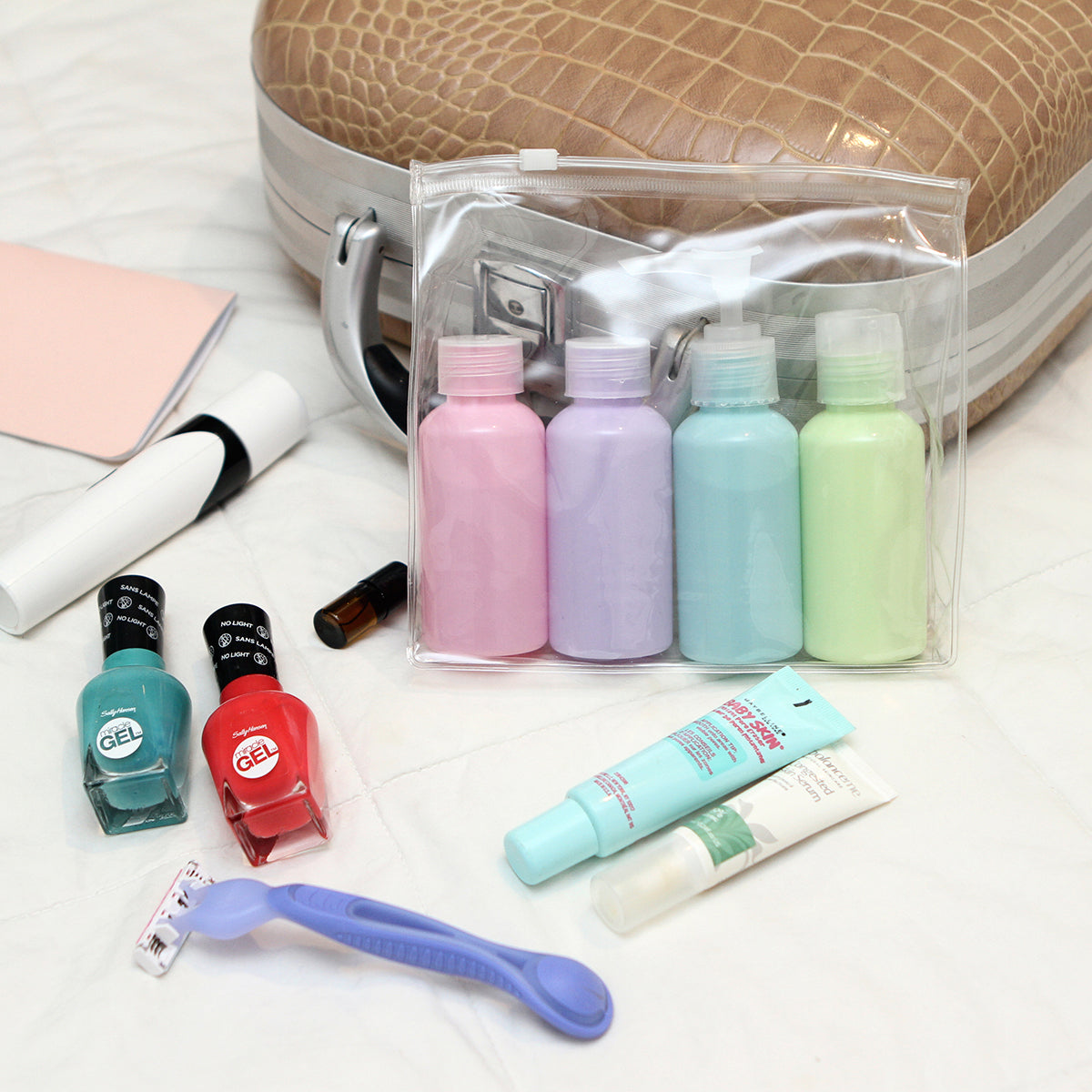 set de 4 botellas fabricadas en plástico pp (polipropileno) con bolsa de plástico pvc translucida que cuenta con cierre tipo ziper para fácil apertura y mayor seguridad. son perfectas para varios cosméticos como shampoo, crema, jabón o acondicionador, resistencia a la compresión, ligereza, reutilizable y sin fugas. capacidad de 100 ml cada una.