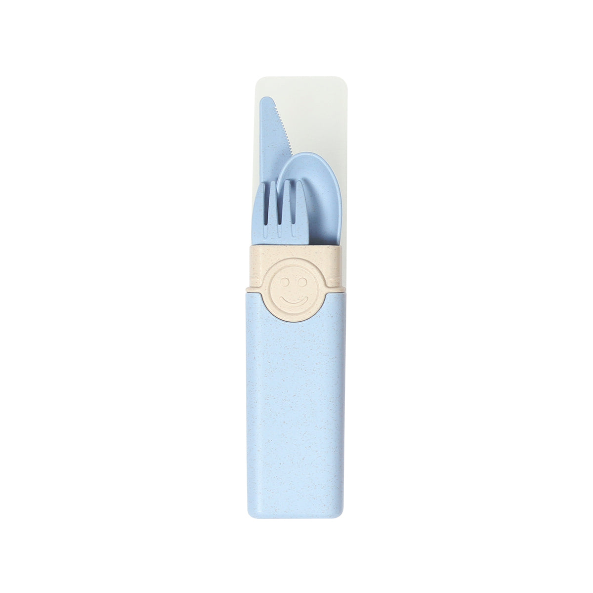 set de cubiertos fabricado en fibra de trigo y polipropileno (pp), ofrece durabilidad y resistencia para un uso prolongado, incluye tres piezas de cubiertos: cuchillo, tenedor y cuchara. la combinación de fibra de trigo y polipropileno garantiza una textura suave. el set viene con un estuche grabado vertical con una cara feliz.