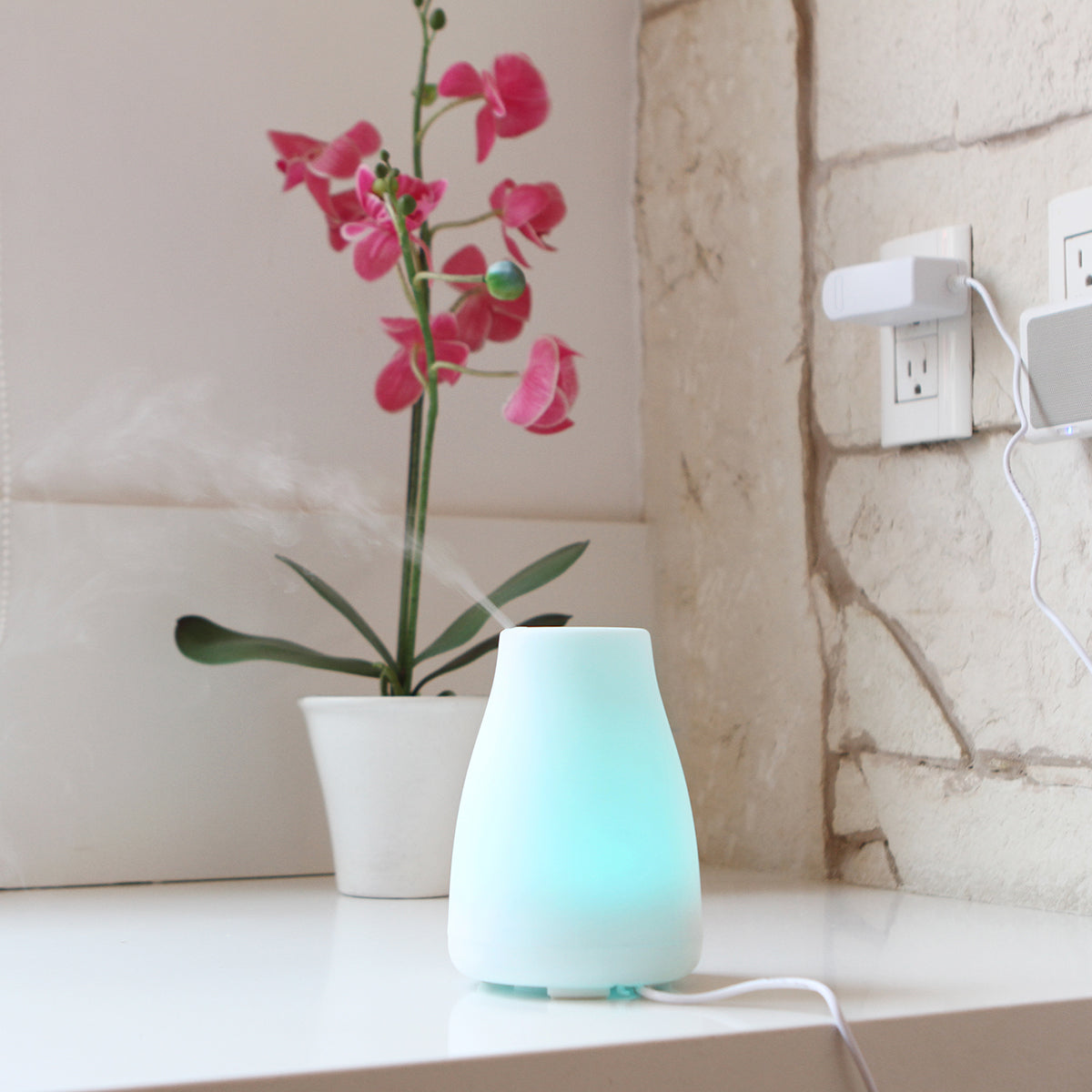 lámpara led con difusor para aceites esenciales, 7 cambios de luz con brillo ajustable, la lámpara y el difusor pueden utilizarse por separado, carga a través de adaptador de corriente. incluye caja de cartón individual. capacidad de 100 ml.