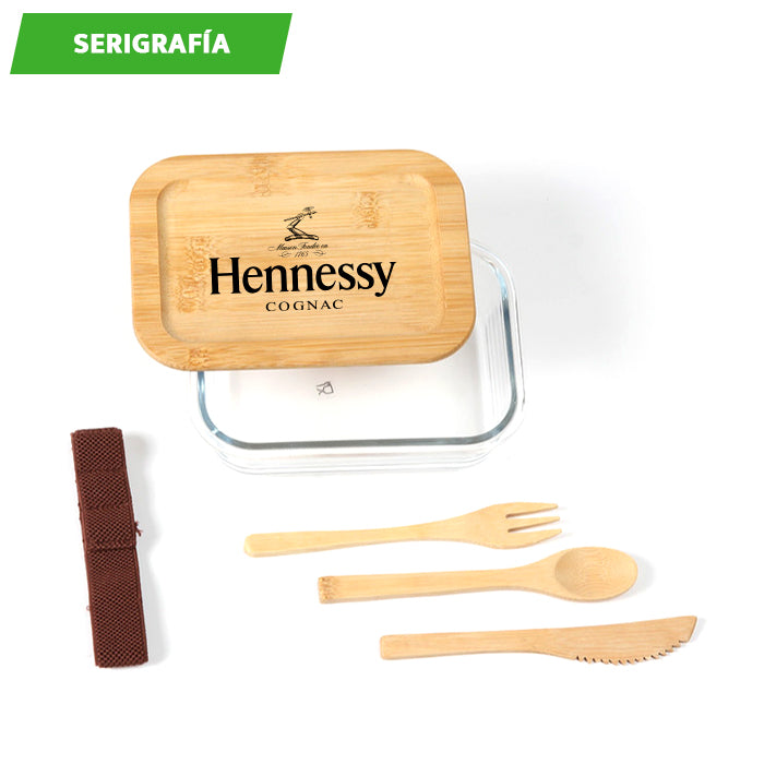 contenedor para alimentos fabricado en vidrio, que garantiza la conservación adecuada de los alimentos, con banda elástica y tapa que se ajusta de forma segura al contenedor, cubiertos de bambú, incluye tenedor, cuchara y cuchillo.