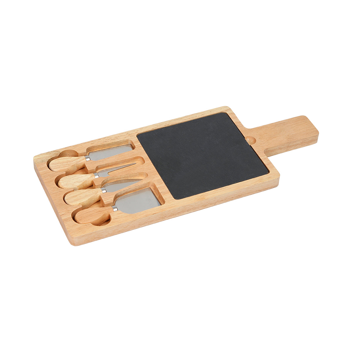 tabla para quesos fabricada en bambú, un material sostenible y resistente que brinda durabilidad, incluye 4 cortadores de acero inoxidable de alta calidad, con mango de bambú y pizarra negra. es una opción perfecta para los amantes del queso que buscan una forma elegante de presentar y servir una variedad de quesos.