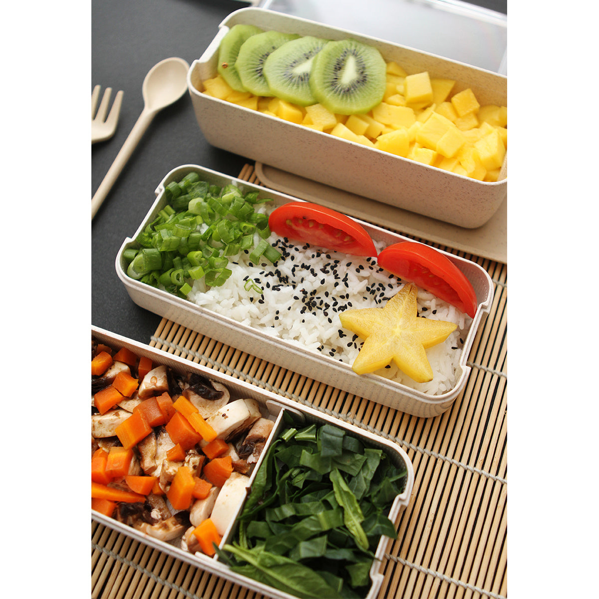 contenedor para alimentos fabricado en 25% fibra de trigo y 75% polipropileno; con 5 compartimentos, tapa transparente de plástico as y cubiertos (tenedor y cuchara) fabricados en el mismo material. capacidad de 900 ml. gracias a su construcción con materiales de alta calidad, este contenedor es resistente y duradero, asegurando que tus alimentos se mantengan frescos y seguros durante tus desplazamientos diarios.