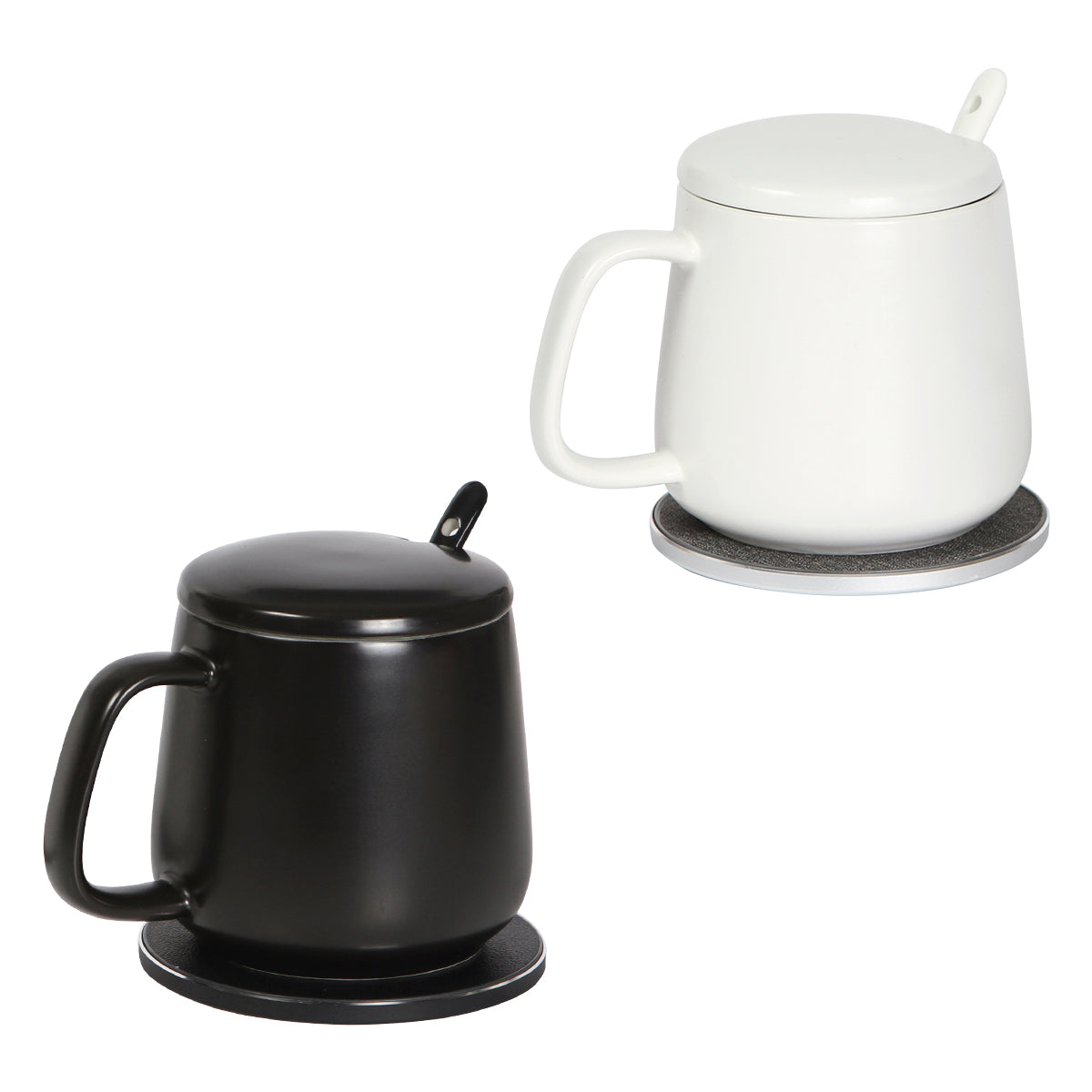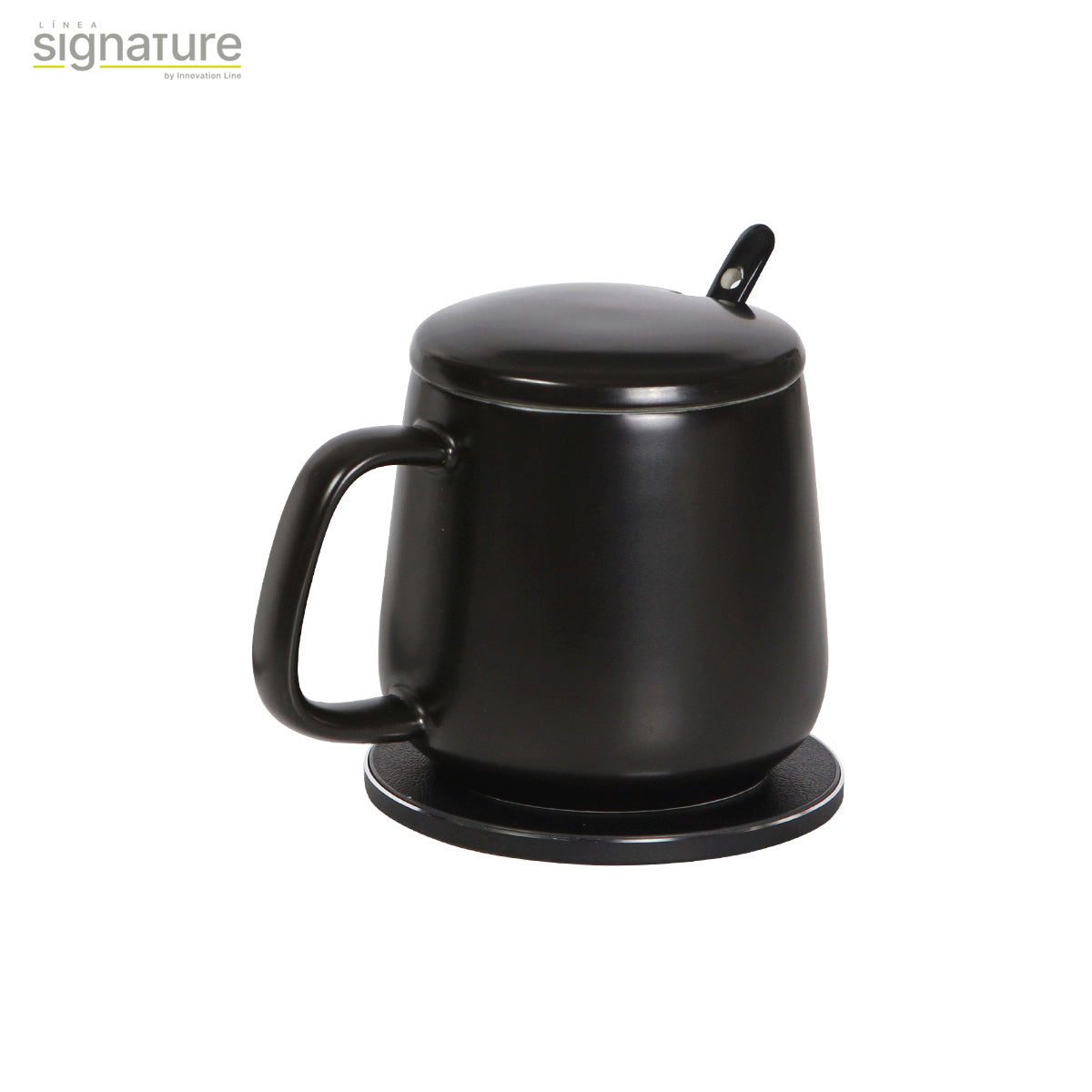 taza de cerámica de 350 ml con calentador y cargador inalámbrico integrado de 10w (wireless para celular). especialmente diseñada para mantener la temperatura de la bebida, con tapa y cuchara a juego. incluye cargador de pared y cable de carga tipo c. incluye caja de cartón individual.