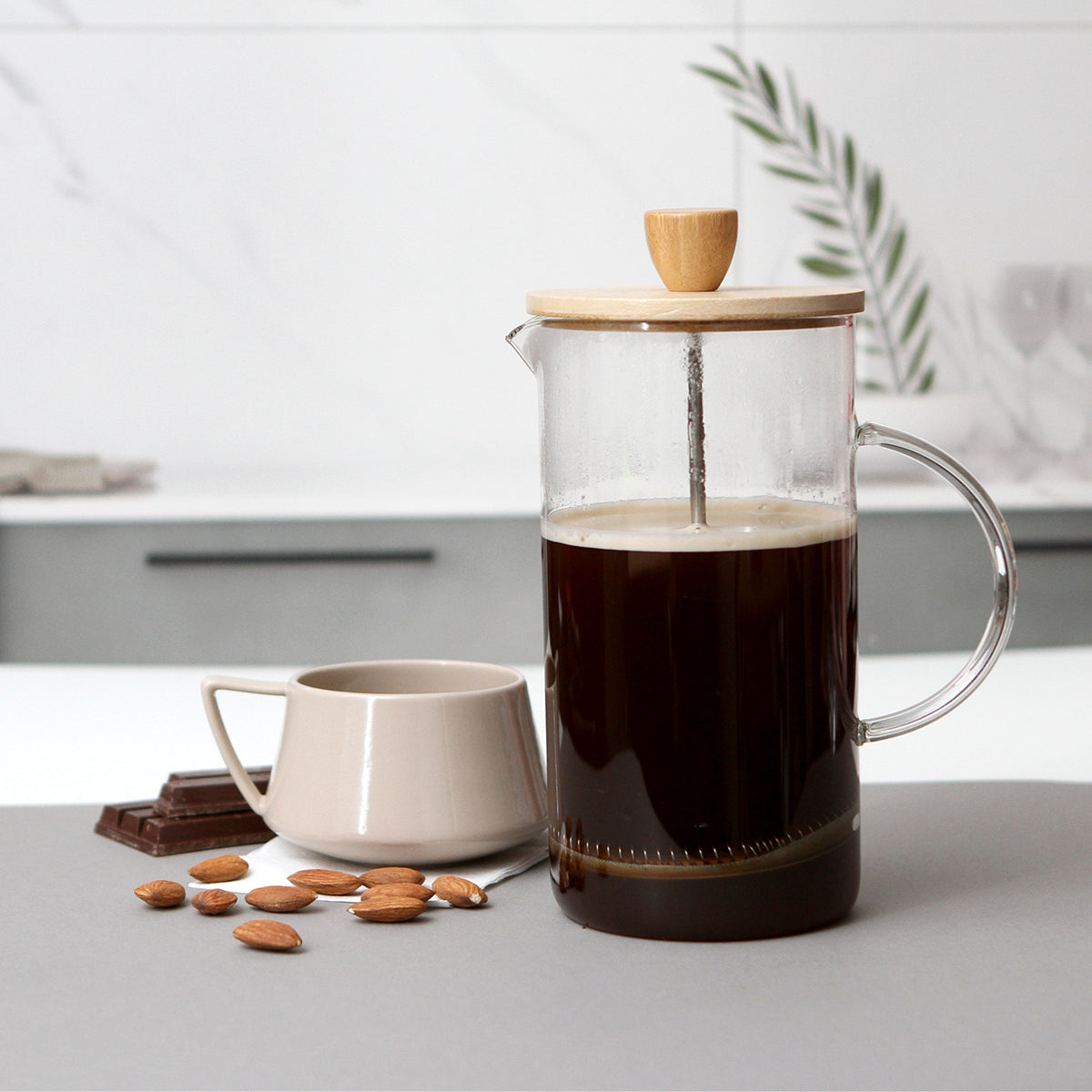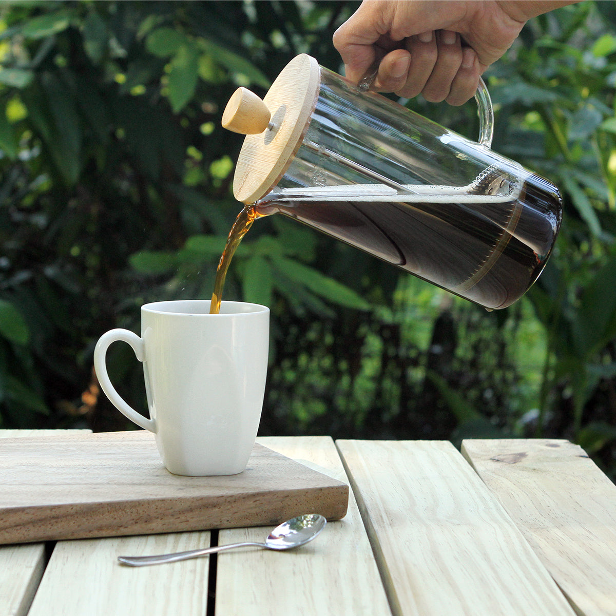 prensa francesa fabricada en vidrio de borosilicato, con detalles en acero inoxidable y tapa de bambú. capacidad 1000 ml. incluye caja de cartón individual.
