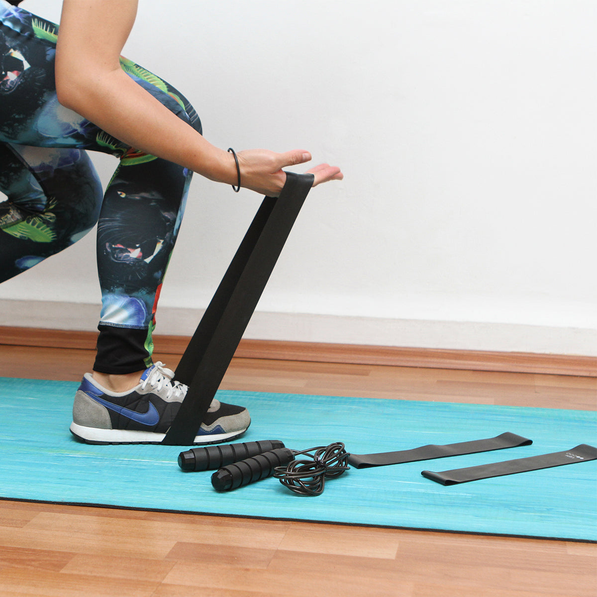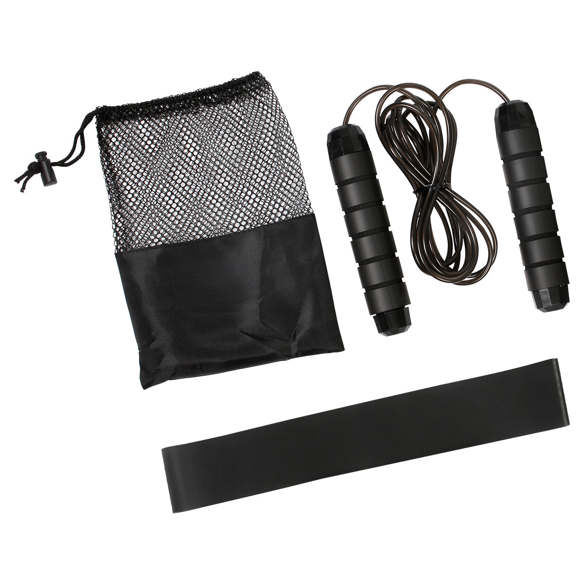 set fitness con 1 banda elástica de 30x5 cm y 1 cuerda de 3 m; ambas fabricadas en caucho. incluye bolso de malla con cordón y broche de seguridad. ideal para llevarlo contigo siempre por su practico tamaño.