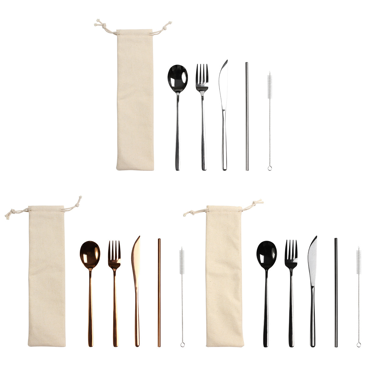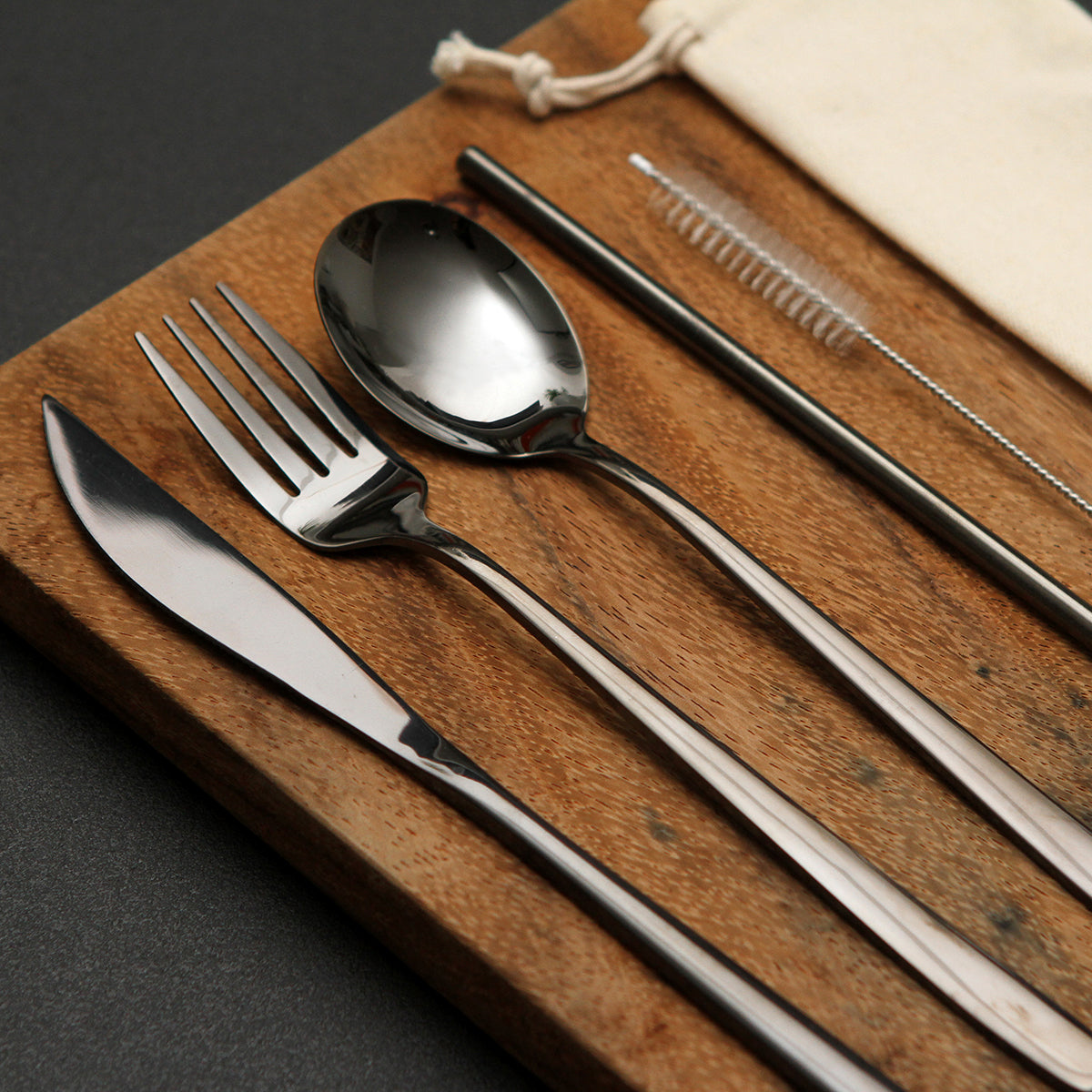 juego de cubiertos fabricados en acero inoxidable; incluye cuchillo, tenedor, cuchara, popote y cepillo limpiador. incluye bolsa de algodón de fácil cierre y apertura. los cubiertos se pueden grabar y la bolsa cuenta con amplia área para impresión. son ideales para viajar y responsables con el medio ambiente.