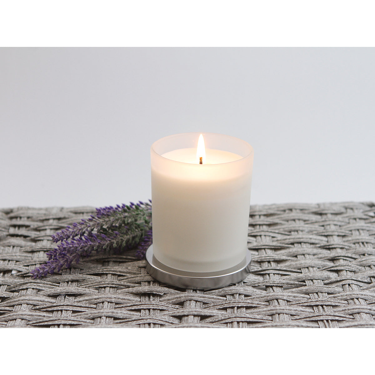vela aromática de cera de soya con esencia de vainilla al 5%, contenedor de vidrio esmerilado y tapa metálica. incluye caja de cartón individual. es el regalo perfecto.