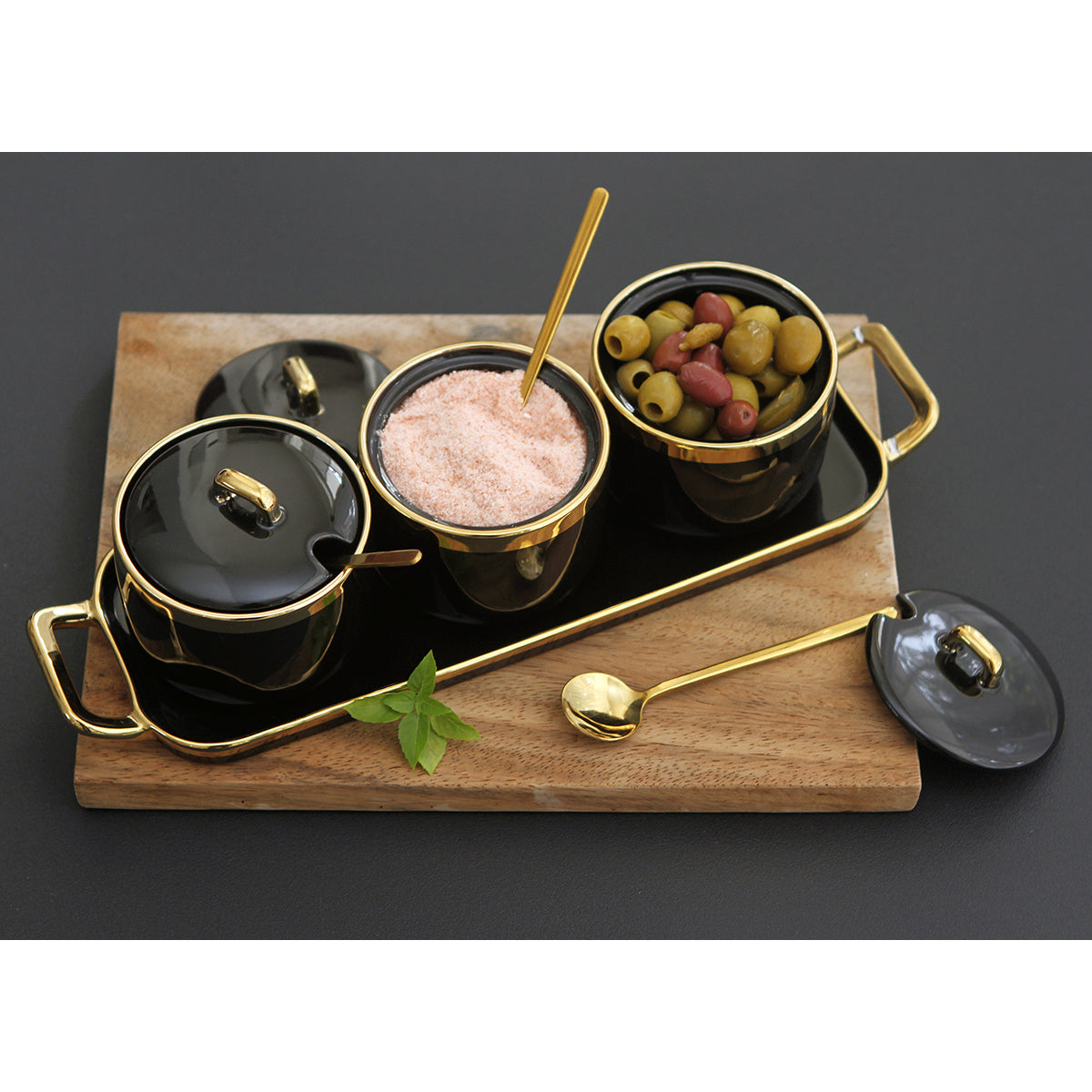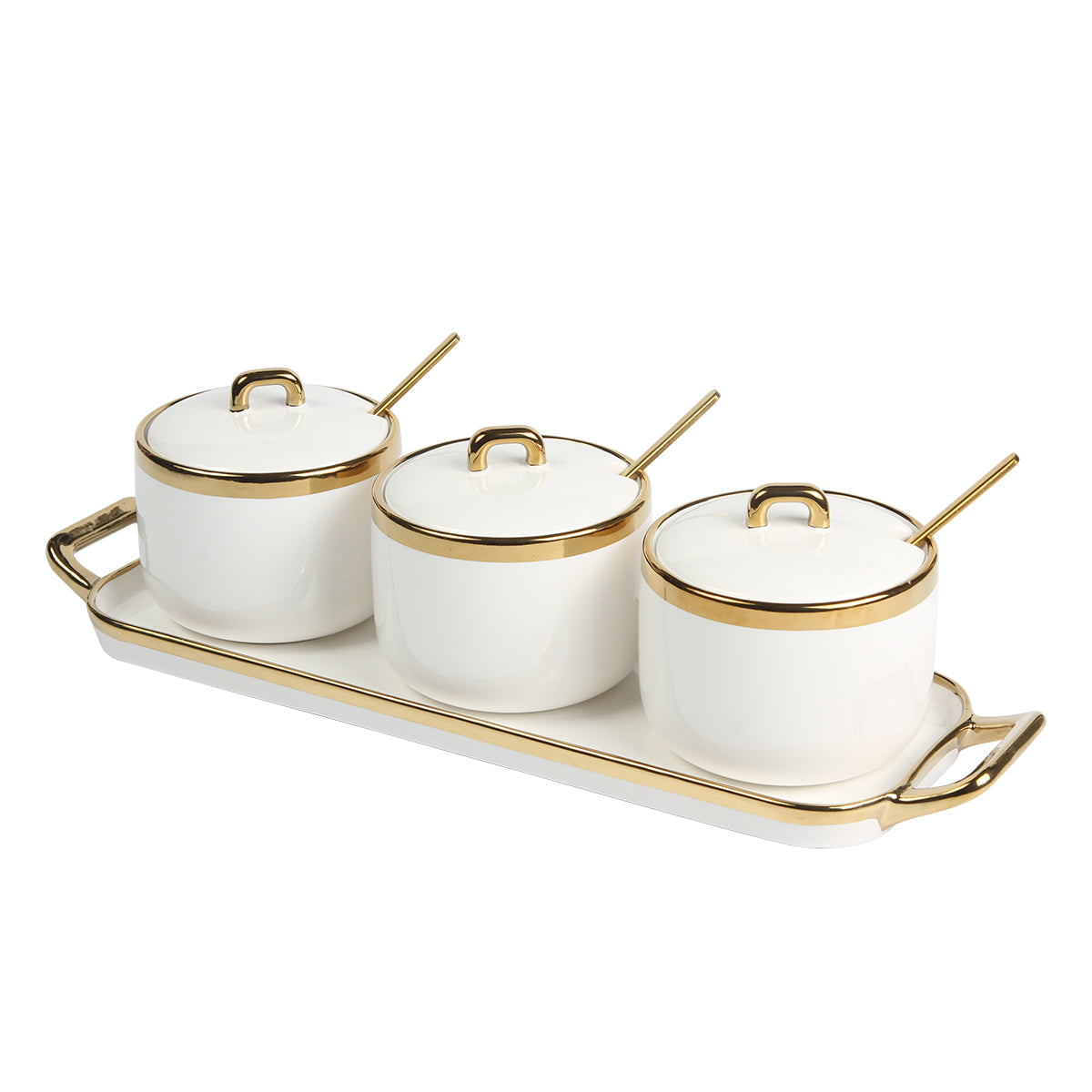 set de 3 contenedores de cerámica con detalles dorados en las tapa, es una elección sofisticada y práctica para almacenar alimentos. capacidad de 320 ml, con detalles dorados, y cucharas doradas metálicas incluidas que van a juego con el set.