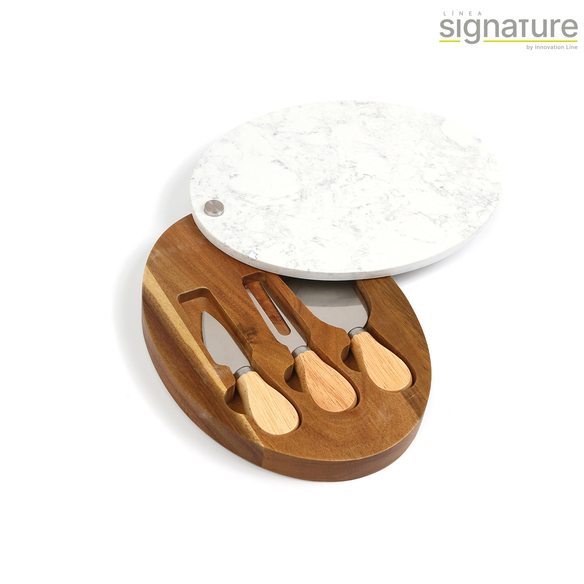 set para quesos fabricado con madera de acacia y mármol gris. en el interior de la tabla cuenta con tres compartimentos para guardar chuchillo, espátula y trinche para quesos. personalizable para que puedas regalar algo único y especial.