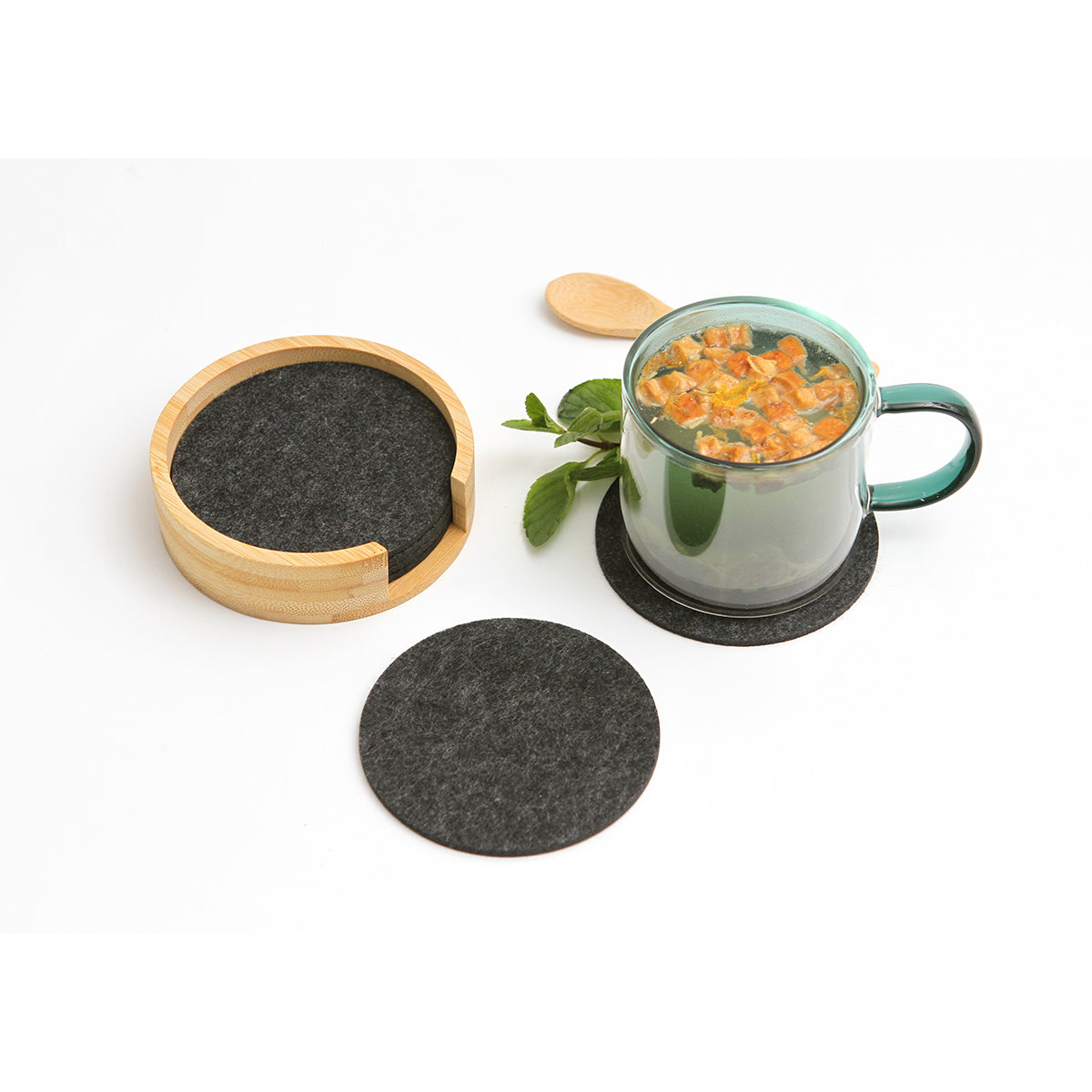 juego de porta vasos, fabricados en rpet con base elaborada en madera de bambú, incluye 6 porta vasos. tanto el rpet como la madera de bambú son materiales conocidos por su resistencia, asegurando que los portavasos se mantengan en excelentes condiciones con el uso diario.