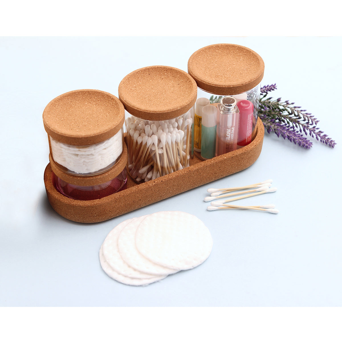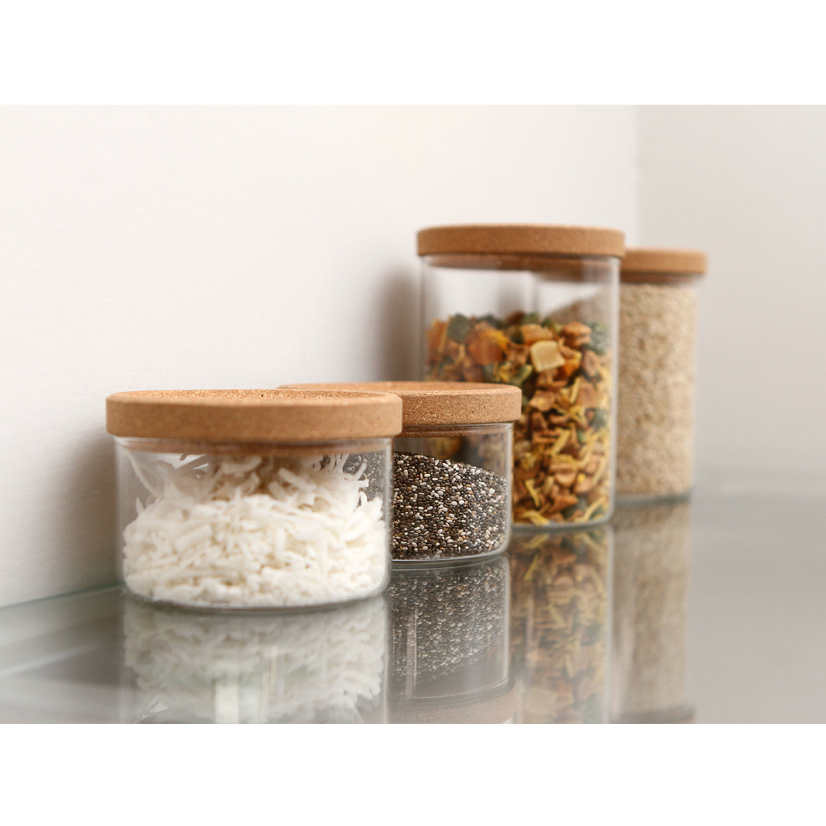 set de contenedores fabricados en borosilicato (vidrio) con tapa de corcho, ideales para alimentos o artículos diversos. incluye dos envases de 8x10 cm, dos envases de 8x4 cm y una base fabricada en corcho.