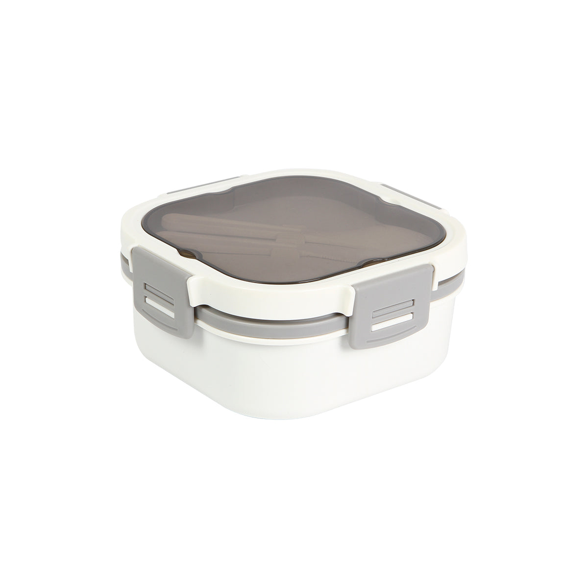 contenedor de alimentos fabricado en plástico pp con 2 compartimentos, tapa con 4 pestañas de seguridad, diferentes divisiones y un contenedor pequeño con tapa, incluye tenedor y cuchara.