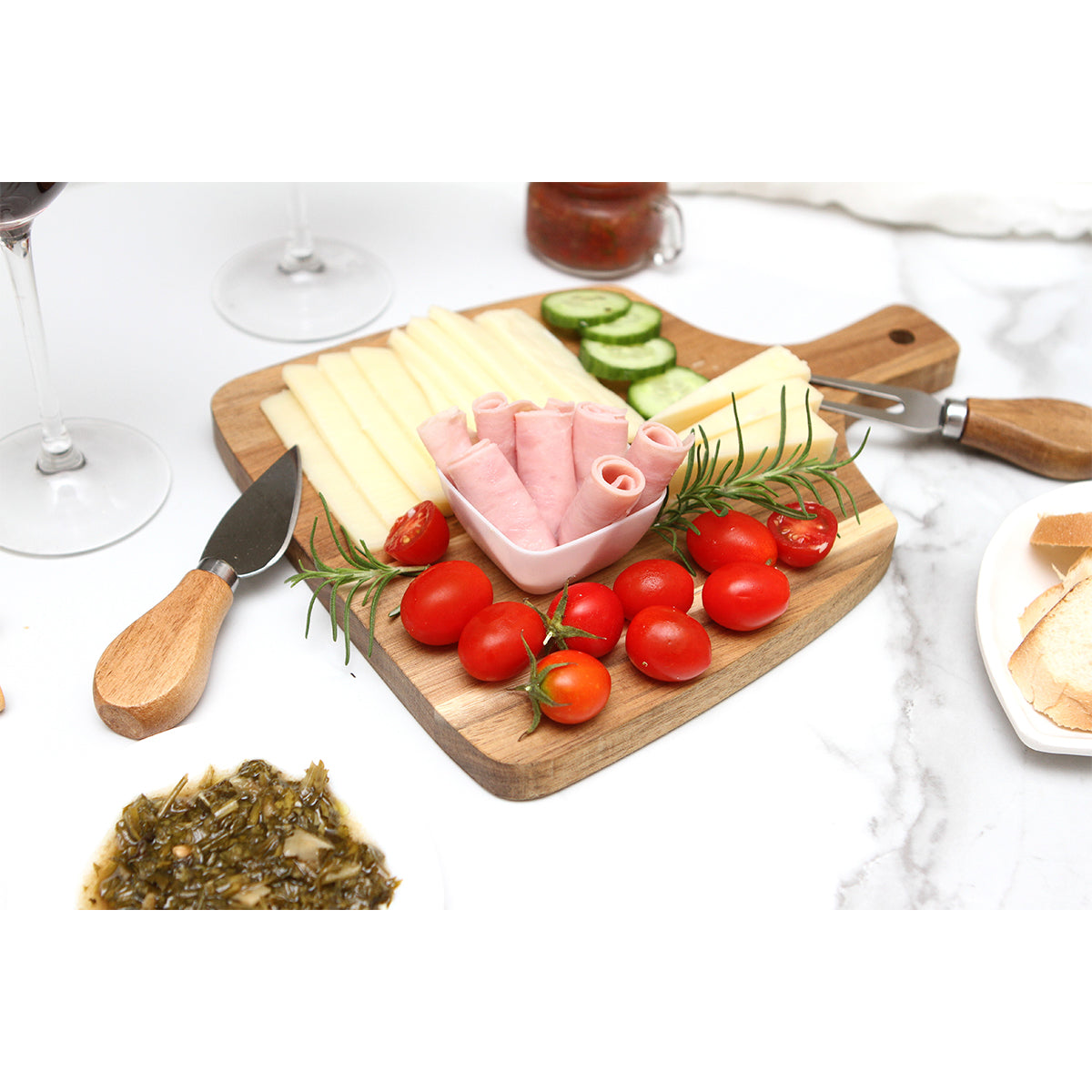 set de quesos fabricado en madera de acacia con acabado natural. incluye tabla de madera, cuchillo y trinche para quesos, fabricados con madera de acacia y acero inoxidable. su diseño práctico la convierte en una pieza versátil, perfecta para acompañar momentos cotidianos con un toque gourmet.