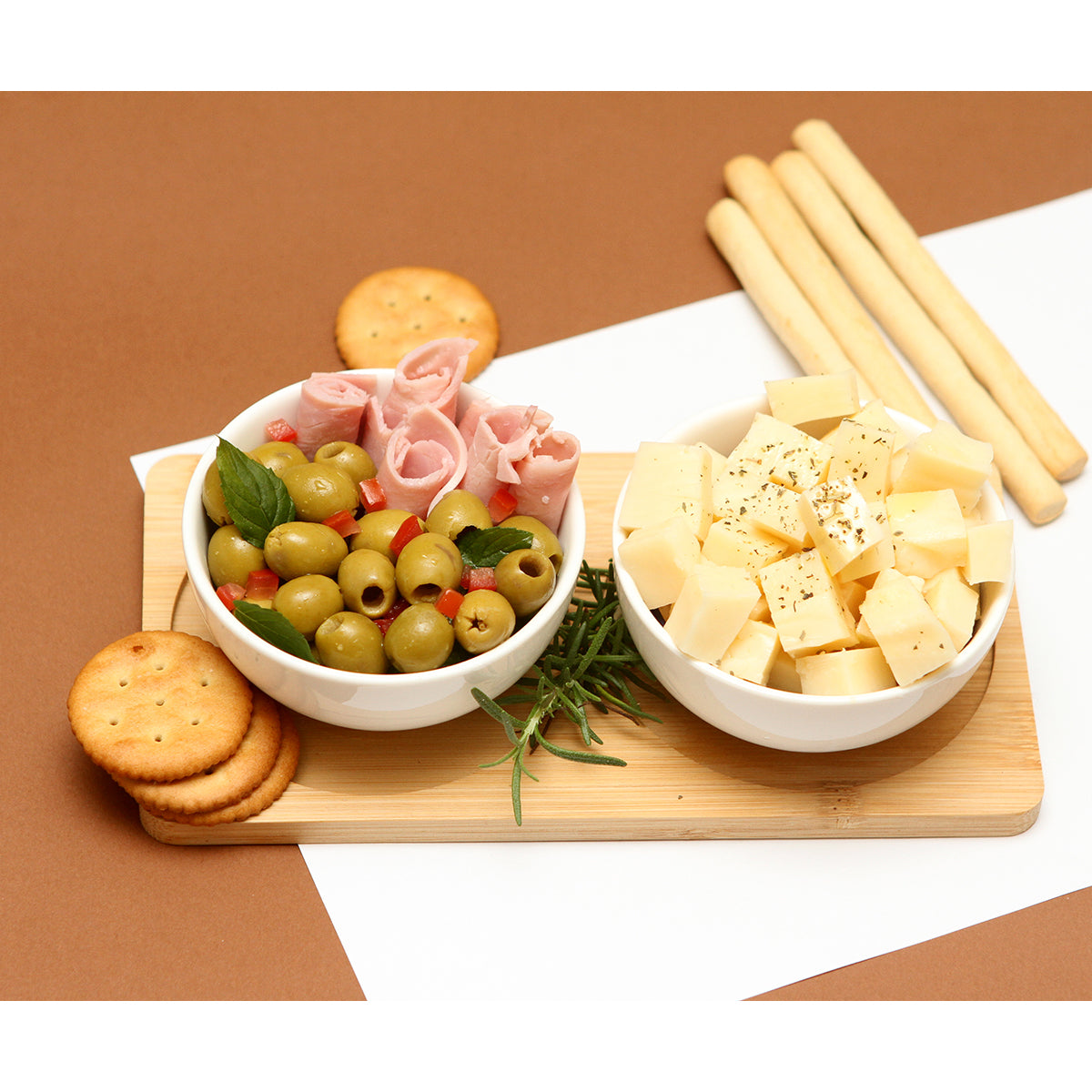 set con dos bowls para alimentos fabricados en cerámica con capacidad de 250 ml, base de madera de bambú adecuada para ambos recipientes.