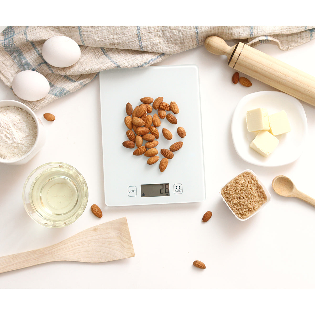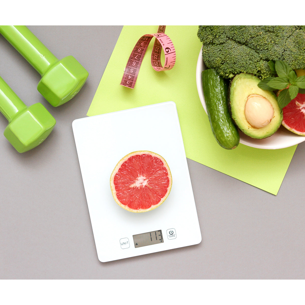 báscula electrónica de uso doméstico para alimentos, con diseño tecnológico de alta precisión. vidrio templado de 3mm. capacidad 5kg u 11 libras.