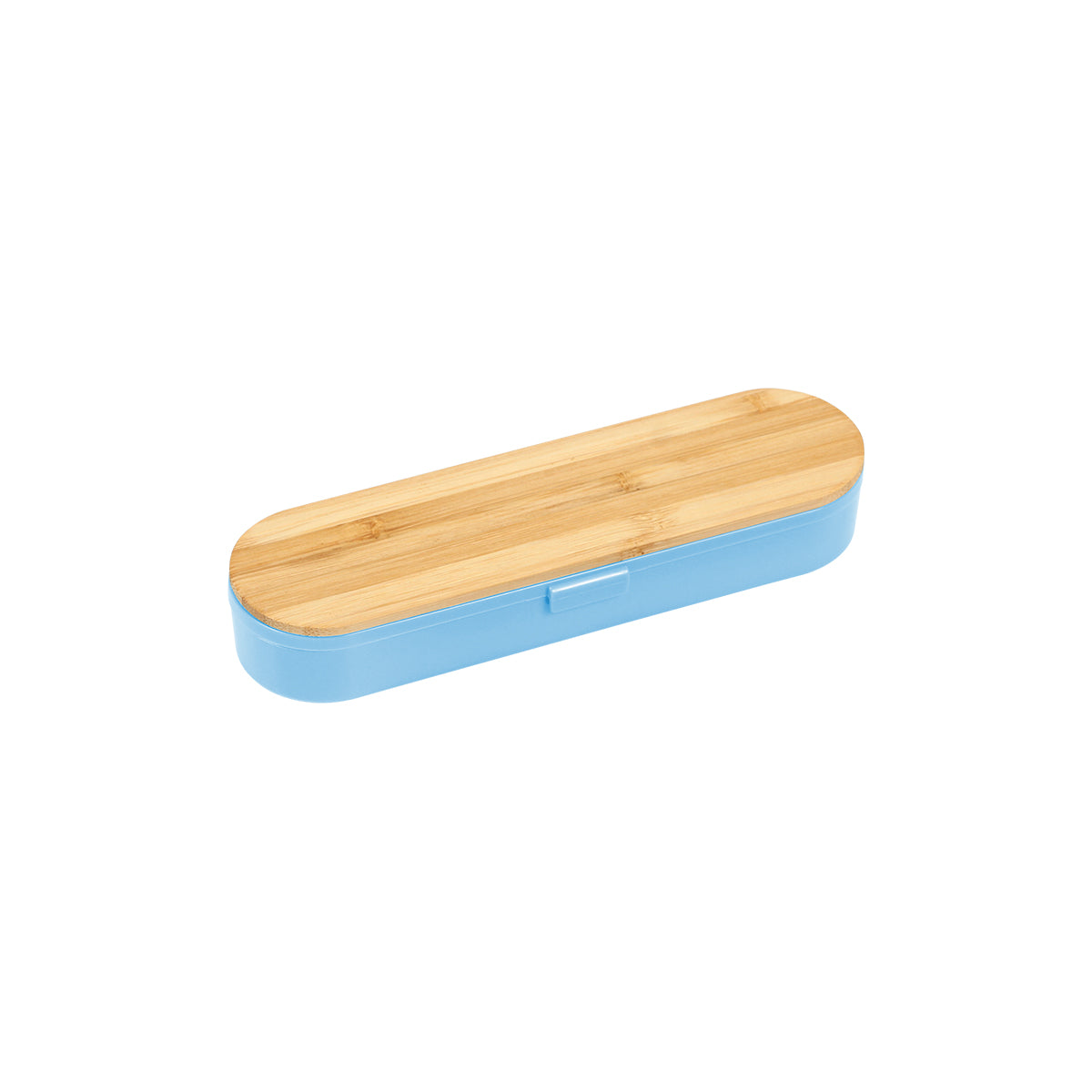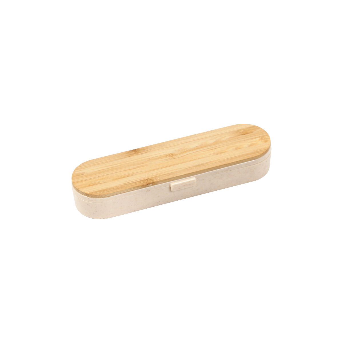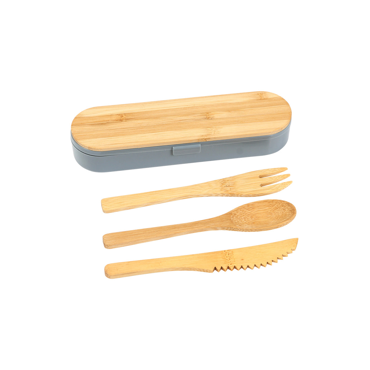 set de cubiertos con estuche fabricado en plástico, con tapa de bambú. incluye cuchara, tenedor y cuchillo fabricados en bambú.