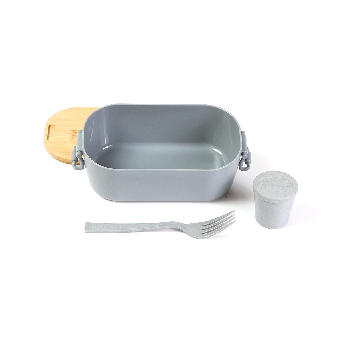 contenedor de alimentos fabricado en polipropileno (pp) y fibra trigo, con tapa de madera de bambú. capacidad de 1,000 ml. incluye tenedor y envase pequeño para alimentos.