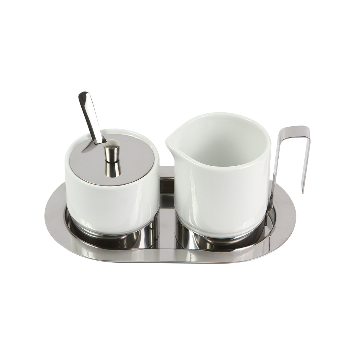 juego de café, fabricado en cerámica y acero inoxidable. incluye taza para crema o leche con capacidad de 300 ml, azucarera (con tapa) con capacidad de 200 ml y cuchara.