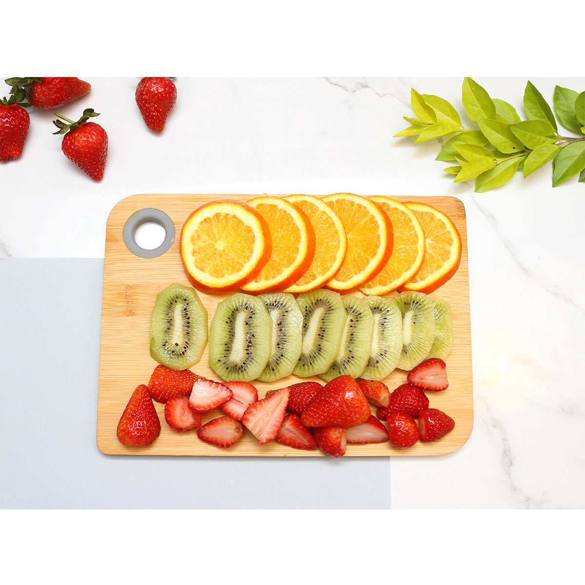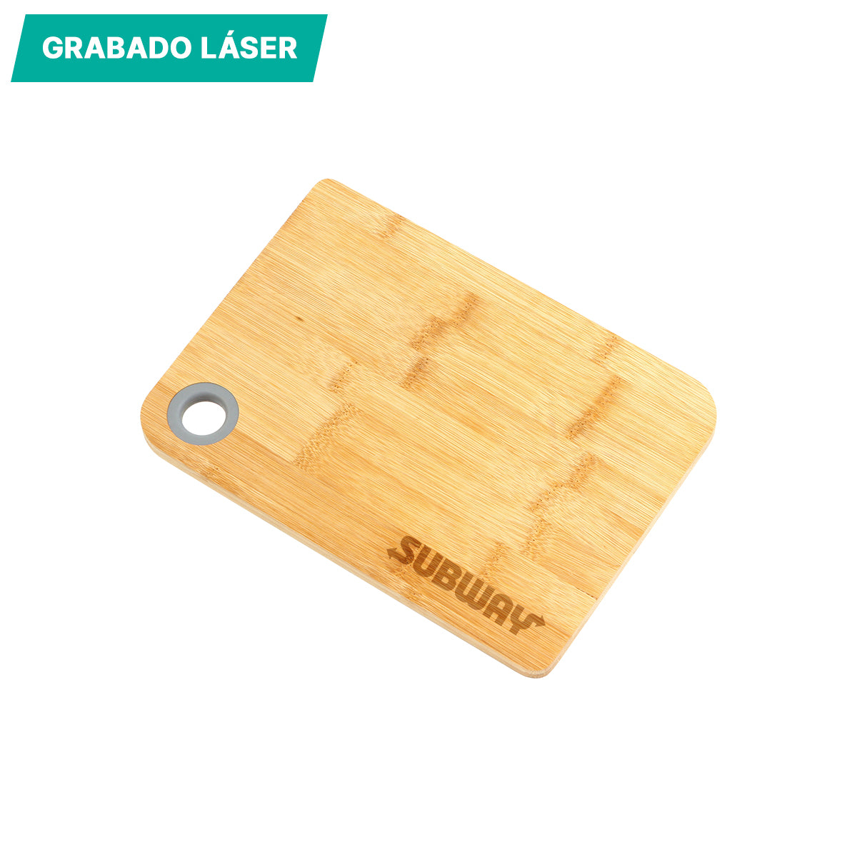 tabla para picar o cortar alimentos, fabricada en madera de bambú. podría proteger sus encimeras utilizando esta tabla de cortar liviana y fácil de almacenar. viene con un anillo de silicona para el pulgar y cumple con la grado alimenticio de la fda. se recomienda lavar a mano y almacenar en seco. cuenta con empaque de papel kraft.